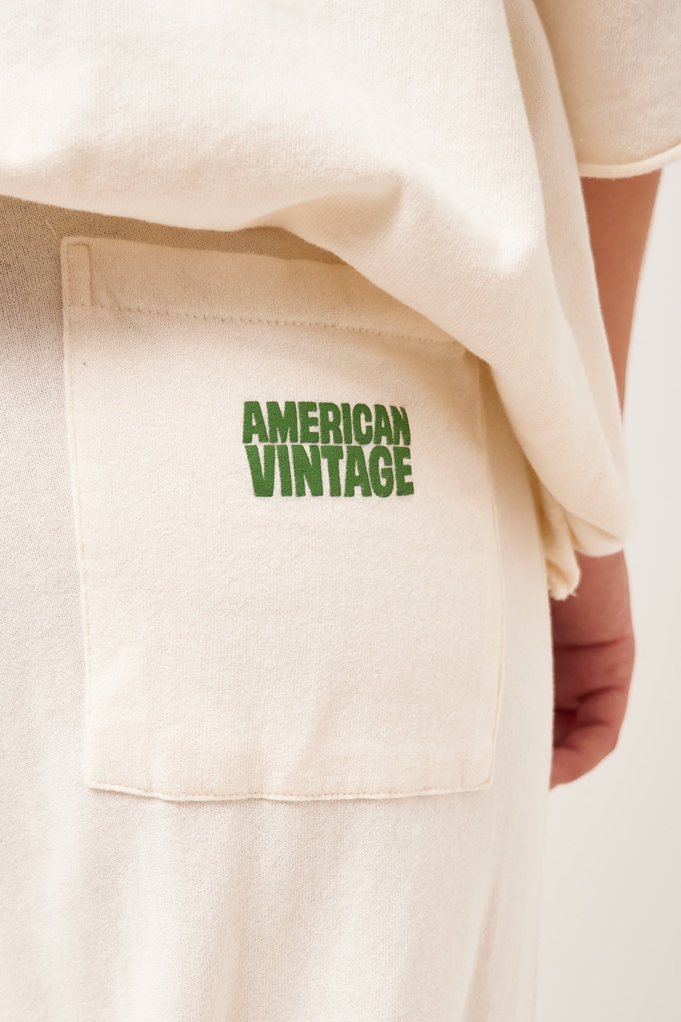 Gixy T-Shirt White from American Vintage. These pants are made of cotton. They are designed in a loose fit with raw edges at the bottom. The pants have side pockets and a back pocket with a printed American Vintage logo. The pants have elastic and a drawstring at the waist.