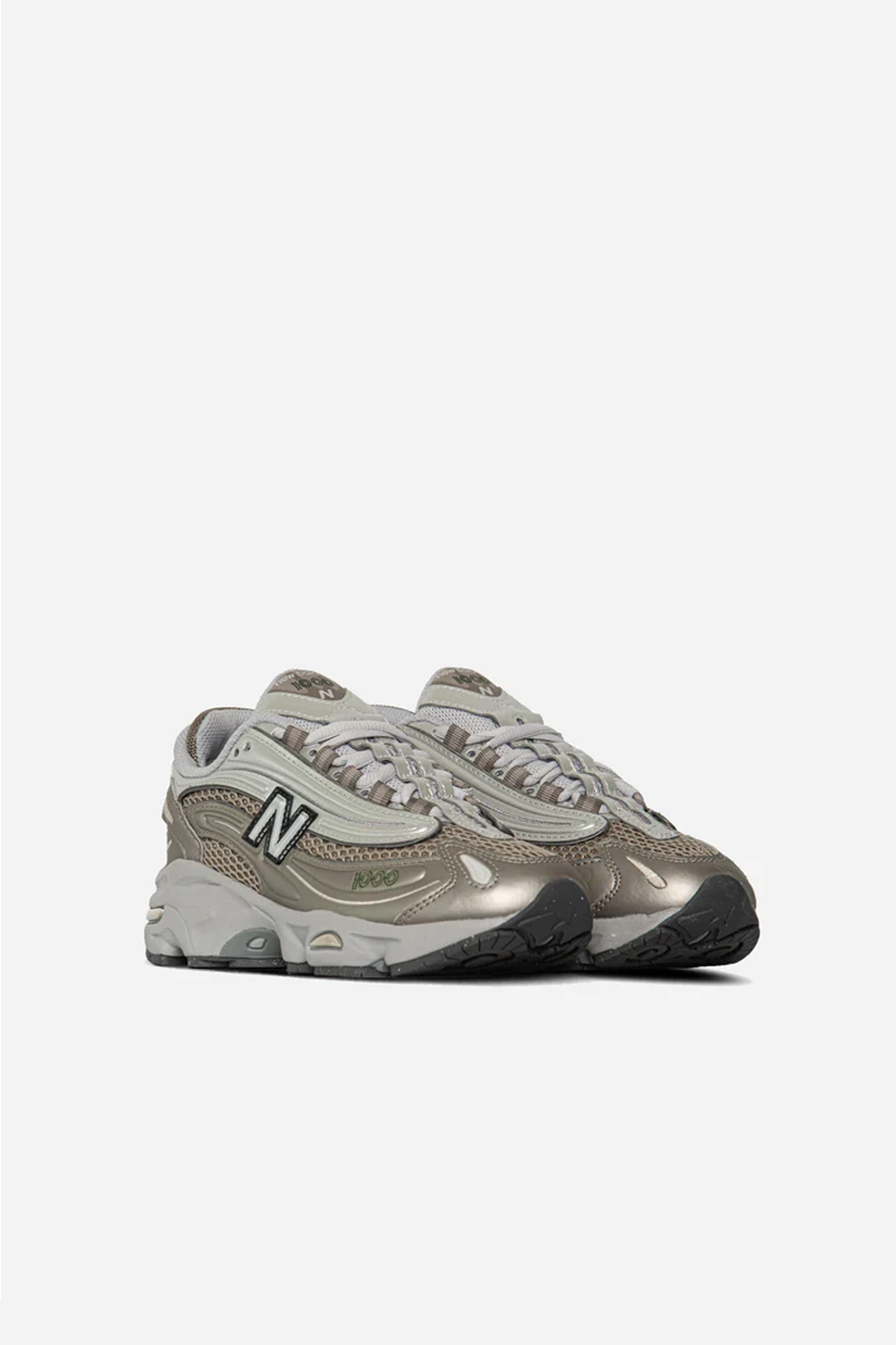 M1000N Arid Stone/Light Silver Metallic from New Balance. These sneakers are made of mesh and leather. They are designed with silver panels and a New Balance logo on each side.