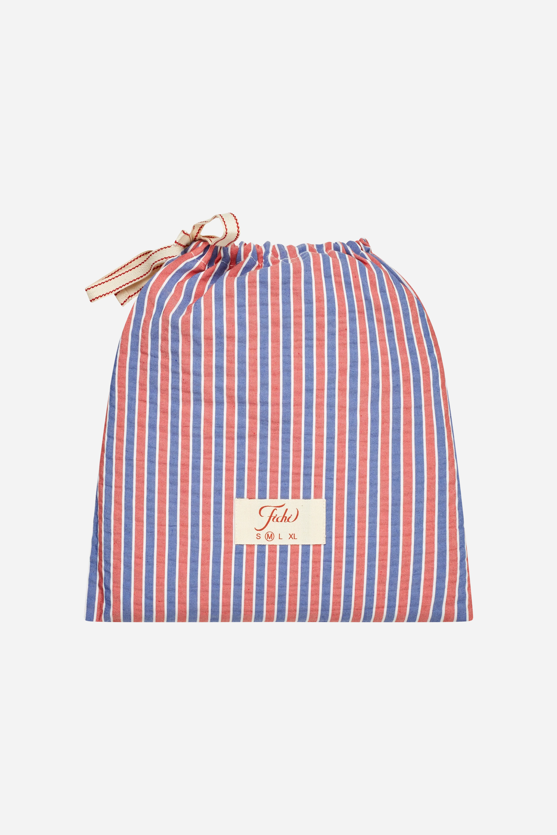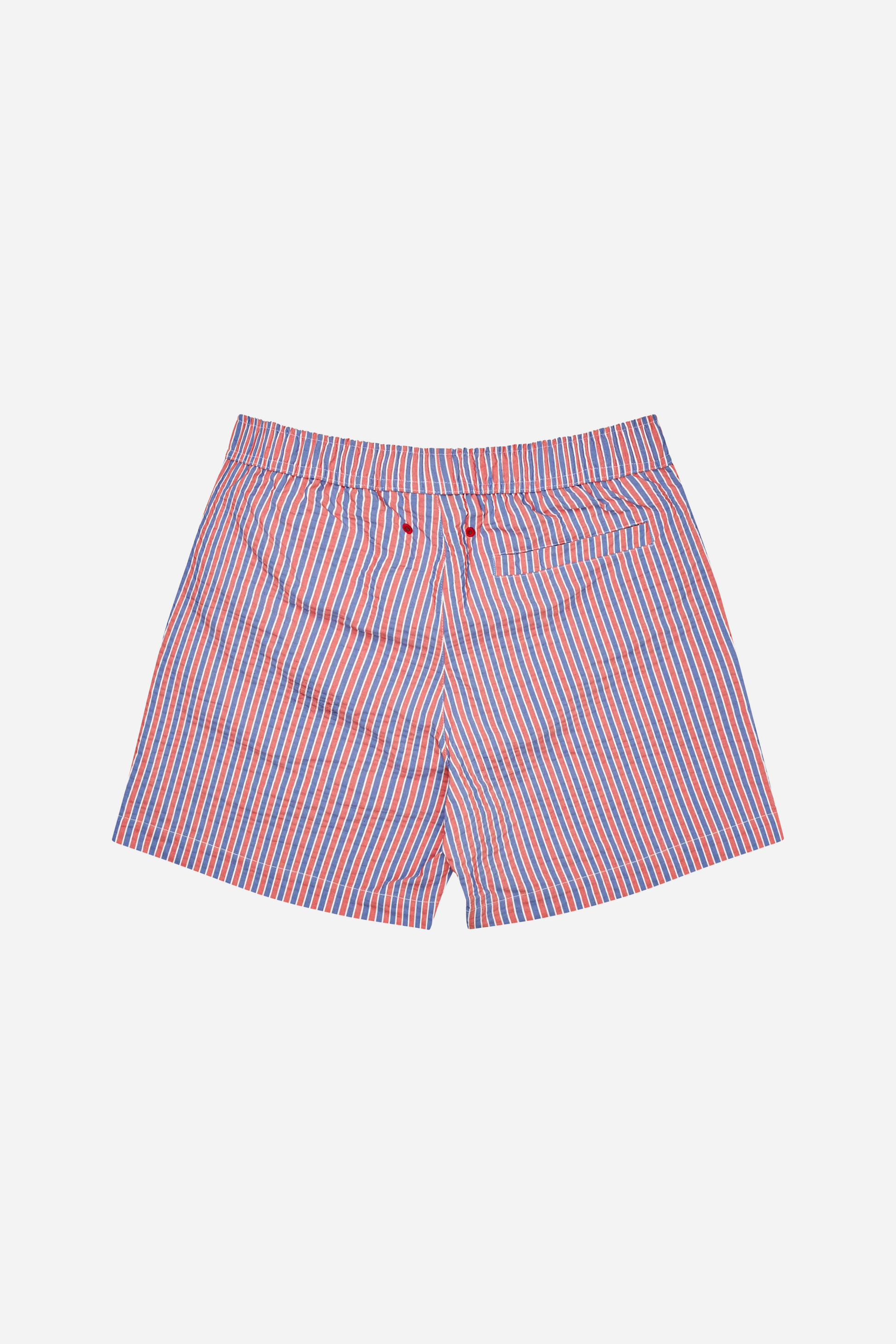 Red And Blue Swim Trunks from Fichi. These swim trunks are made from a SEAQUAL® polyester and cotton blend. They are designed with short legs, elastic and drawstring waist, side pockets and a back pocket on the right side. The swim trunks have a Fichi logo embroidered on the left side of the front.