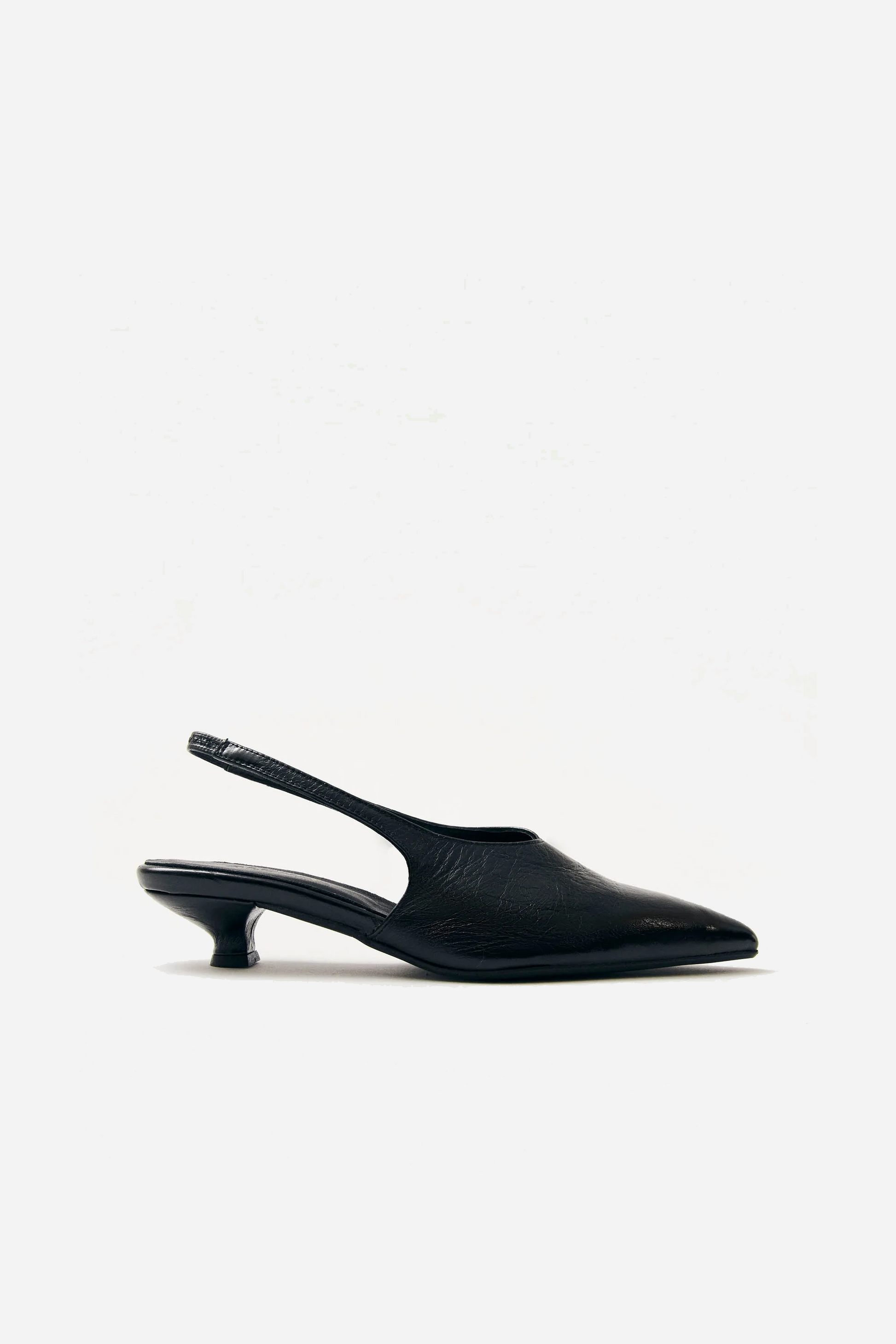 Eros Leather Pumps Black from ALOHAS. These shoes are made of leather. They are designed with a pointed toe, elastic strap, and heel.