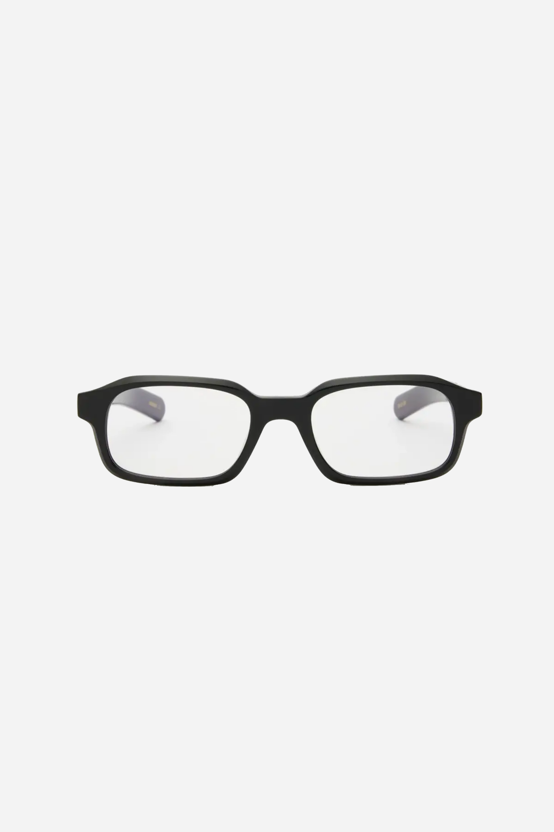Hanky ​​Solid Black/Clear Lens Blue Light from Flatlist Eyewear. The glasses are made of handmade acetate. They have scratch-free lenses with 100% UVA/UVB protection and come in a box with case and microfiber cloth.