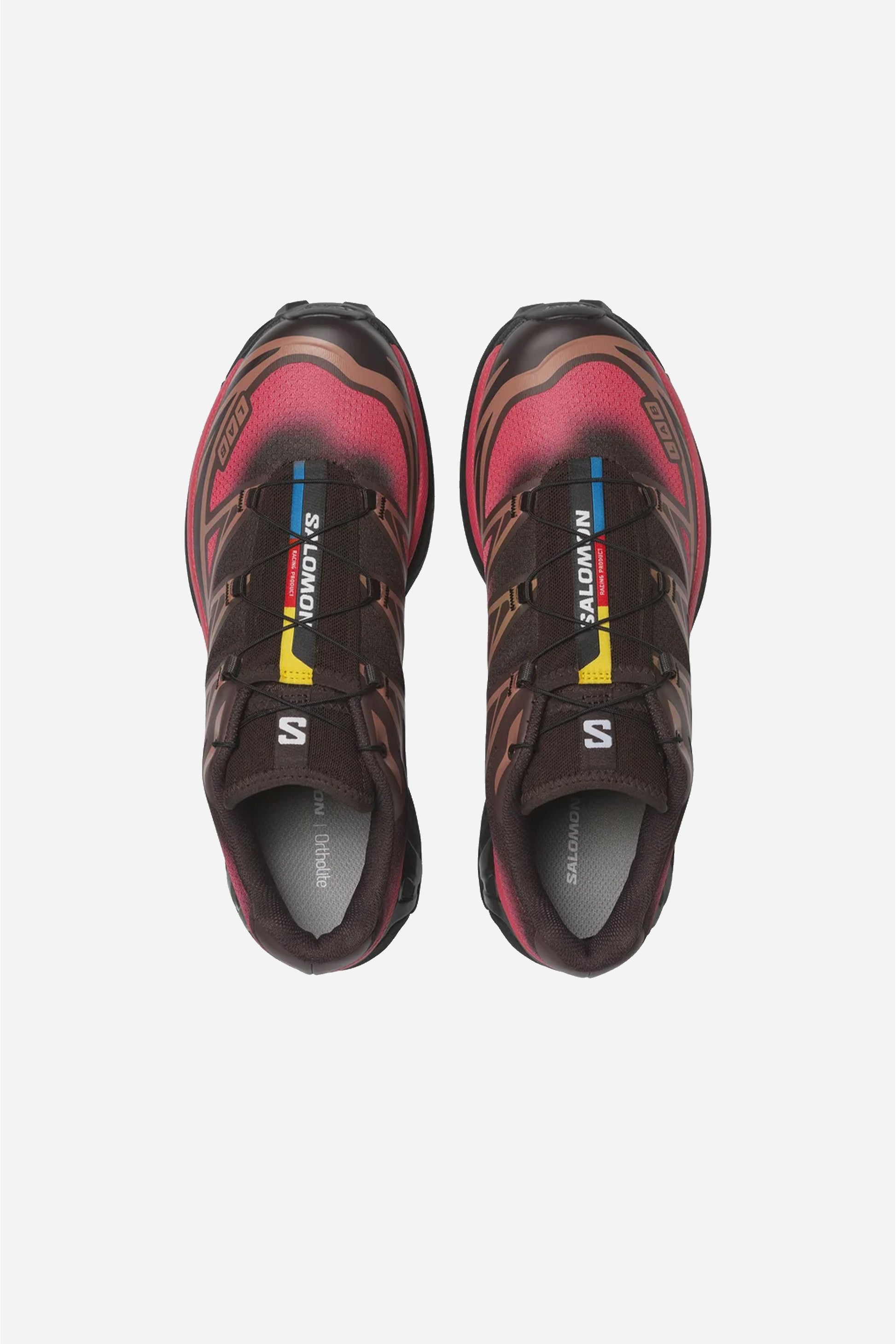 XT-6 Skyline Black Coffee/Roast/Rouge Red from Salomon. These sneakers are made of mesh and rubber. They have the classic Salomon logo on the inside and outside. These sneakers are closed and tightened with laces.