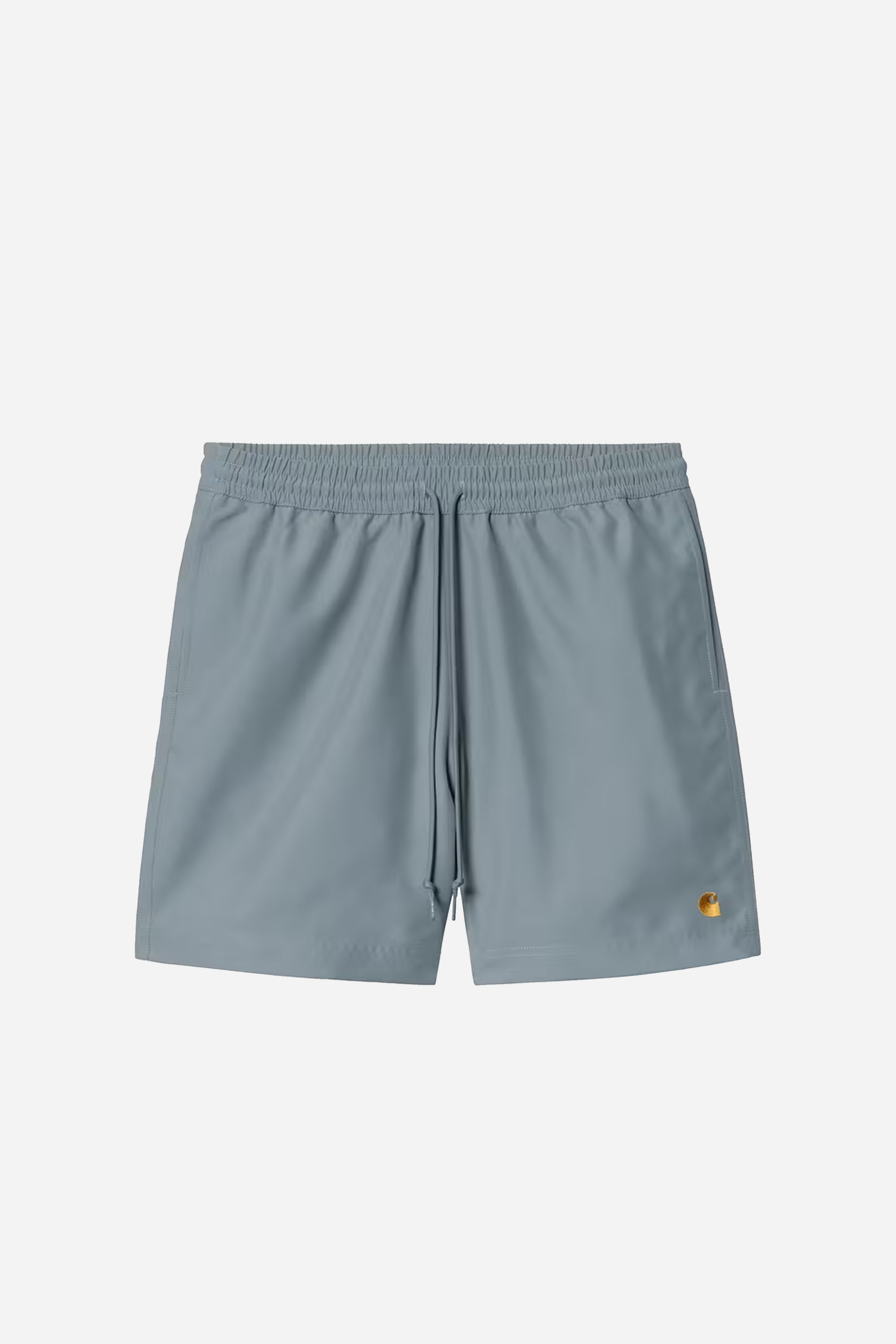 Chase Swim Trunks Velvet Blue/Gold from Carhartt WIP. These swim shorts are made of polyester. They are designed with short legs, a back pocket on the right side and have an elastic and drawstring waist. They have an embroidered Carhartt WIP logo on the bottom of the left leg.