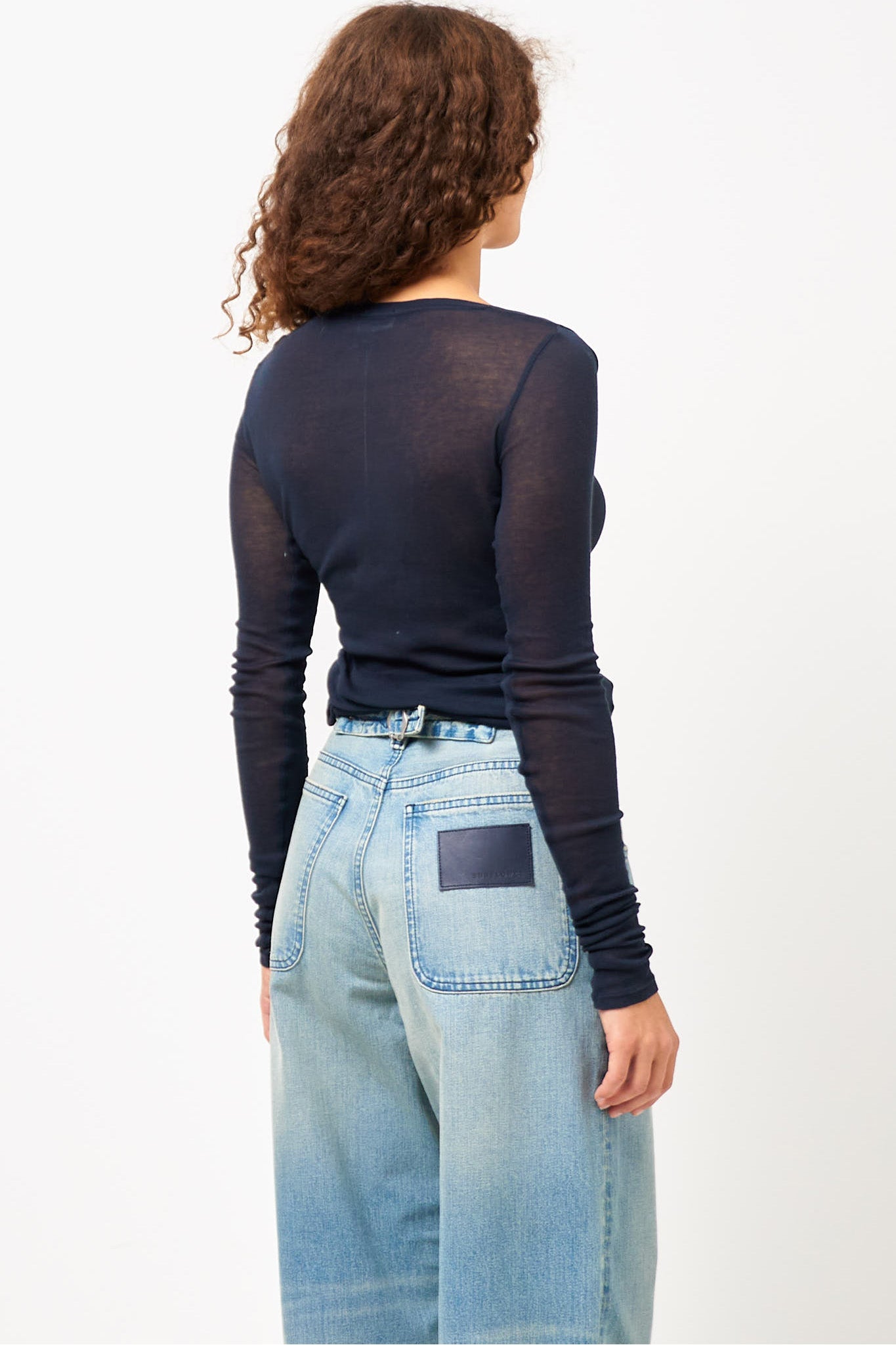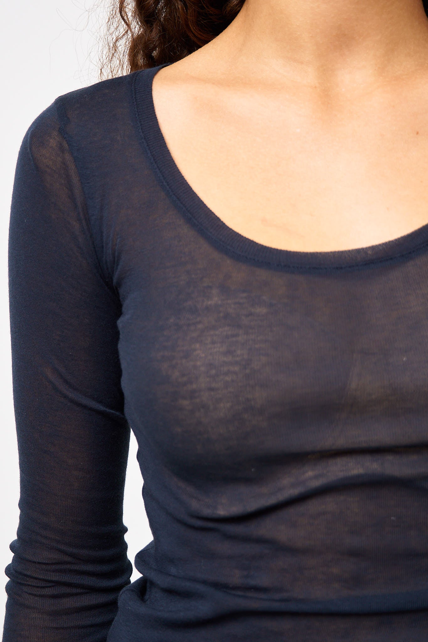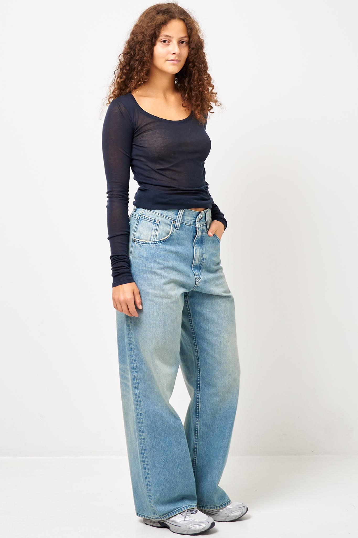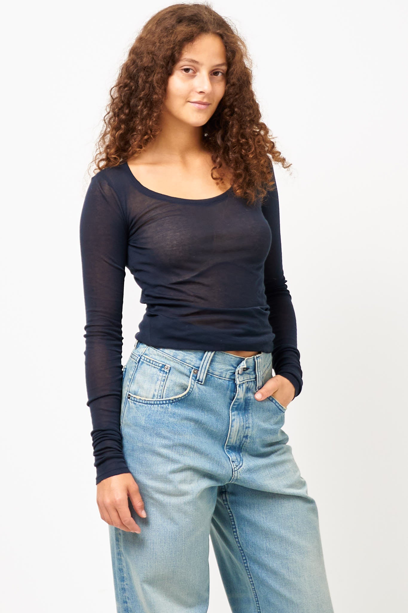 Massachusetts LS T-shirt Navy from American Vintage. This top is made of cotton. It is designed with a deep round neckline, long sleeves and has a tight fit.