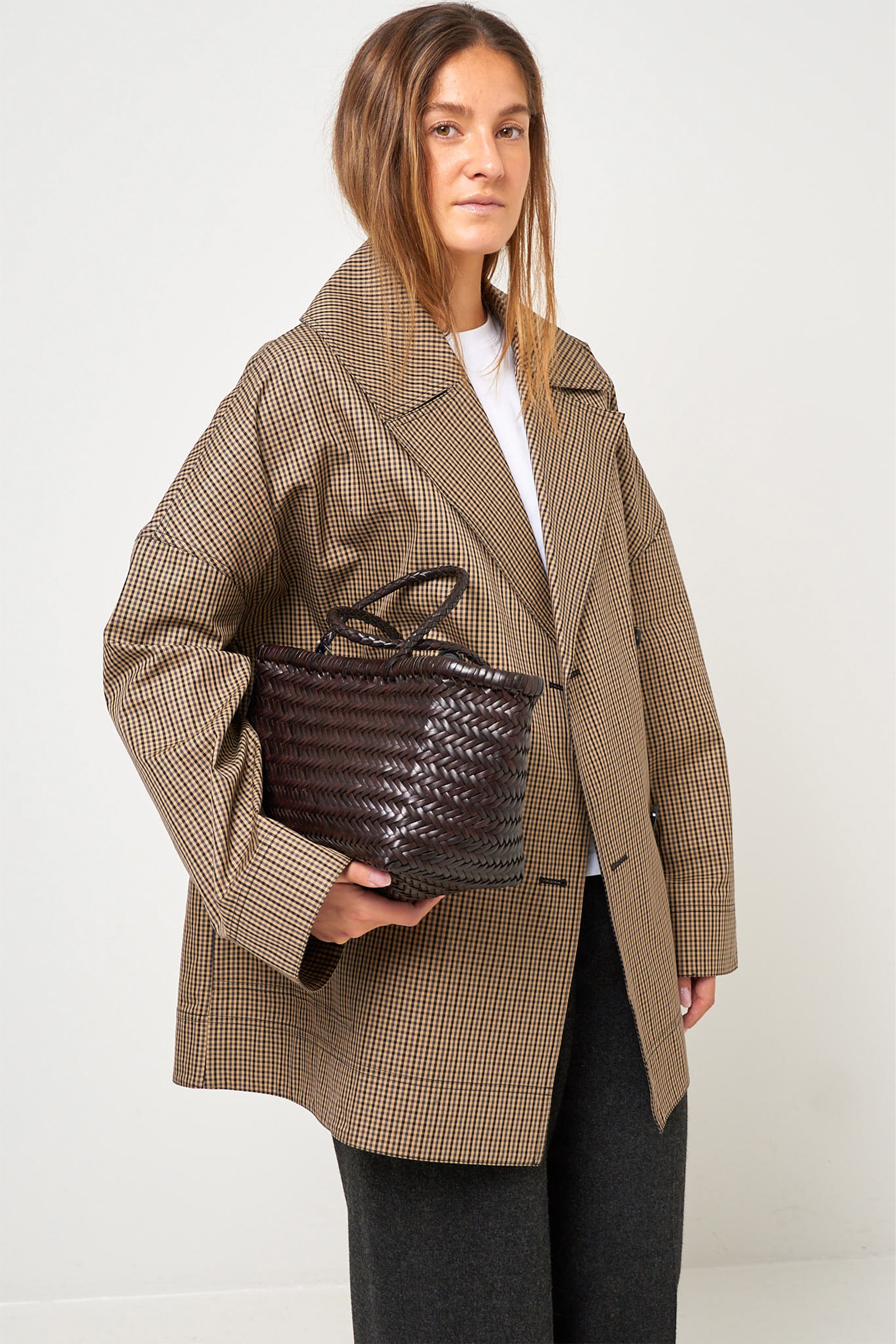 Bamboo Triple Jump Small Dark Brown by Dragon Diffusion. This bag is handmade in India and is designed in braided leather. The bag has a large interior compartment, a pendant and two straps.