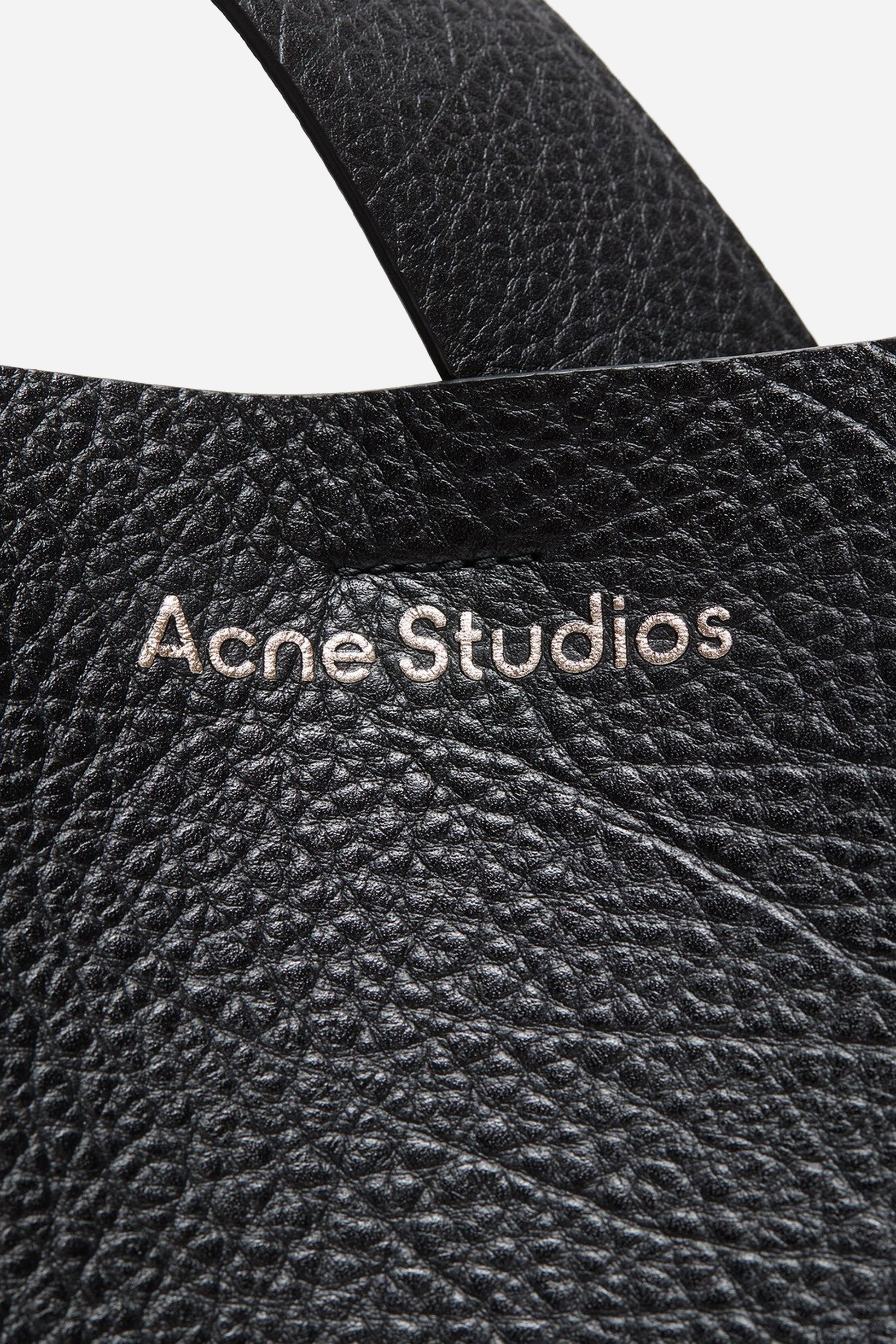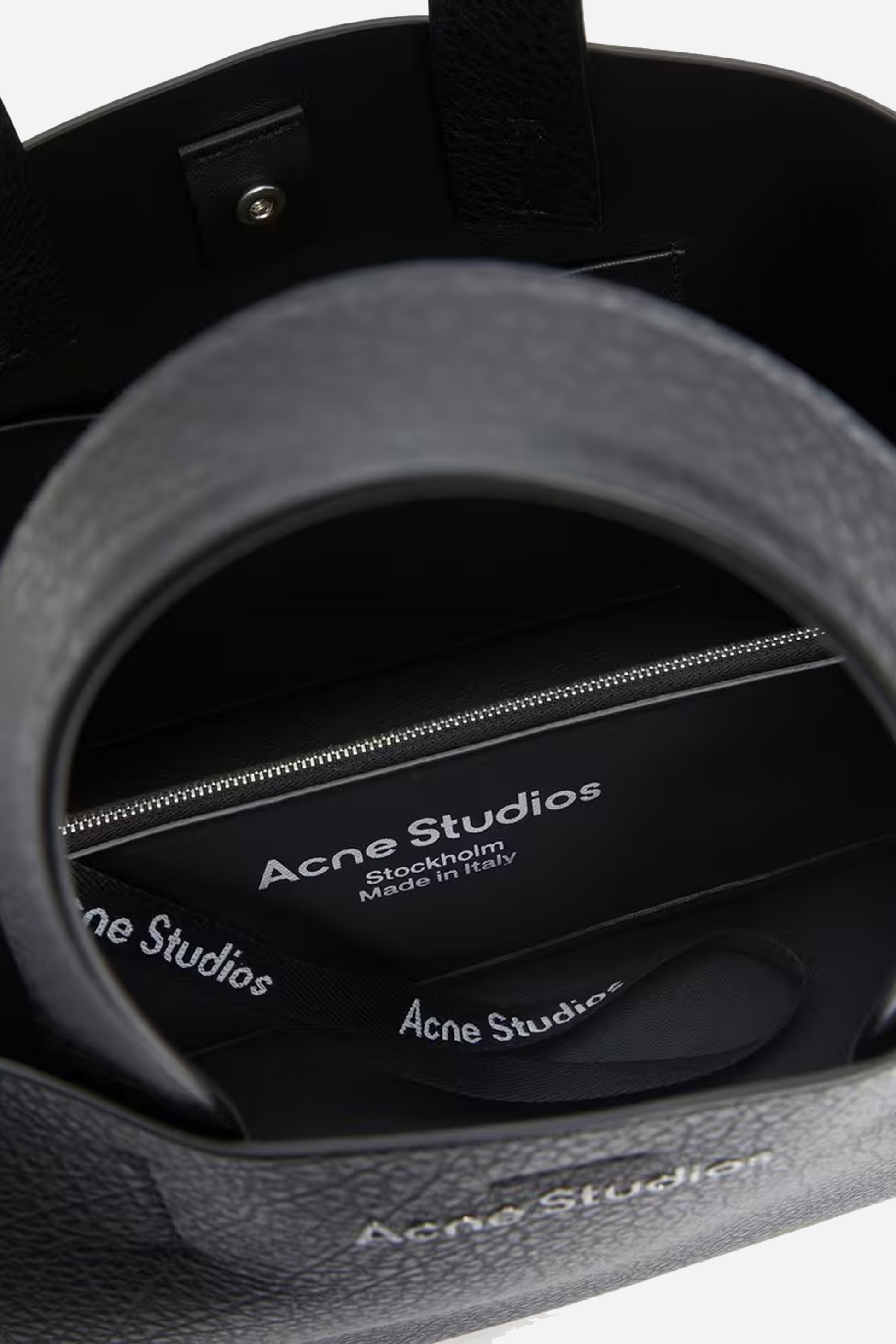 Musubi Midi Tote Black from Acne Studios. This bag is made of soft leather and is produced in Italy. It is designed with two musubi knots on each side, inspired by Japanese Obi sashes. The bag has two straps and a longer strap that can be adjusted. The inside of the bag has a large compartment and a smaller side pocket with the Acne Studios logo printed on it.
