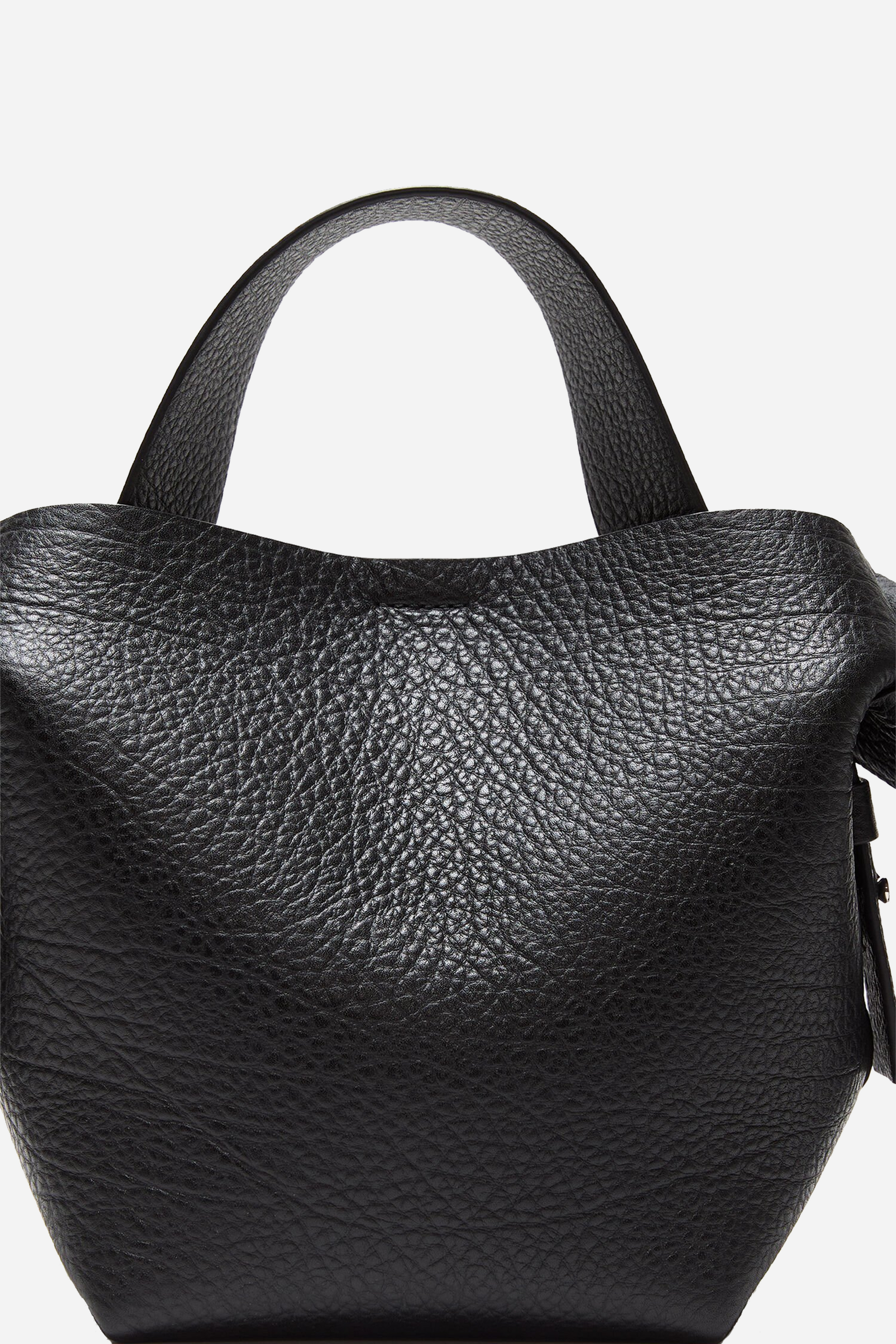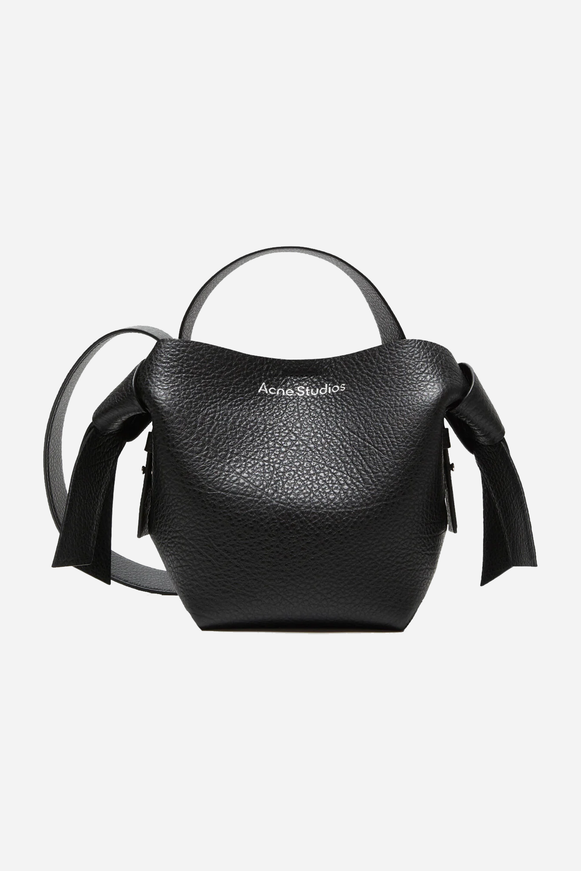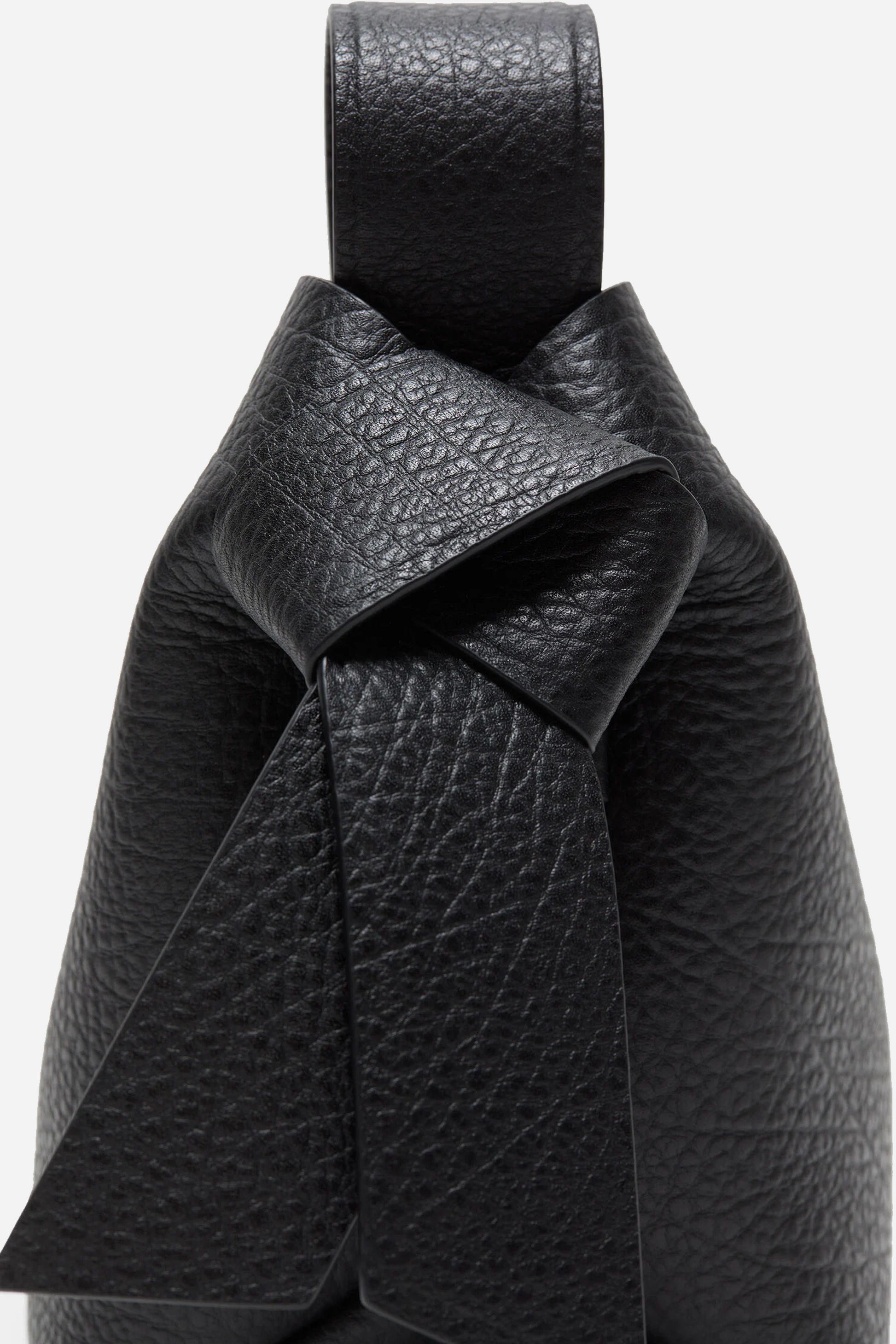 Musubi Mini Shoulder Bag Black from Acne Studios. This bag is made of soft leather. It is designed with a knot detail on both sides. The bag has a handle and an adjustable shoulder strap. The bag has two large compartments on each side of a small pocket that closes with a zipper.