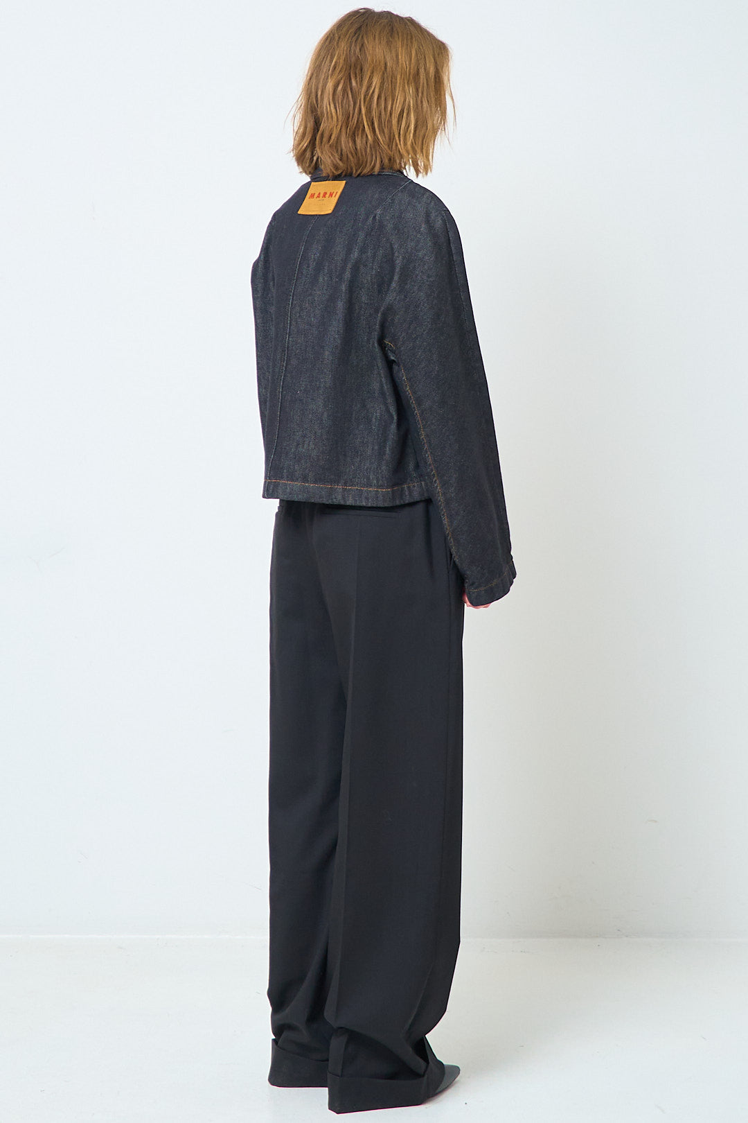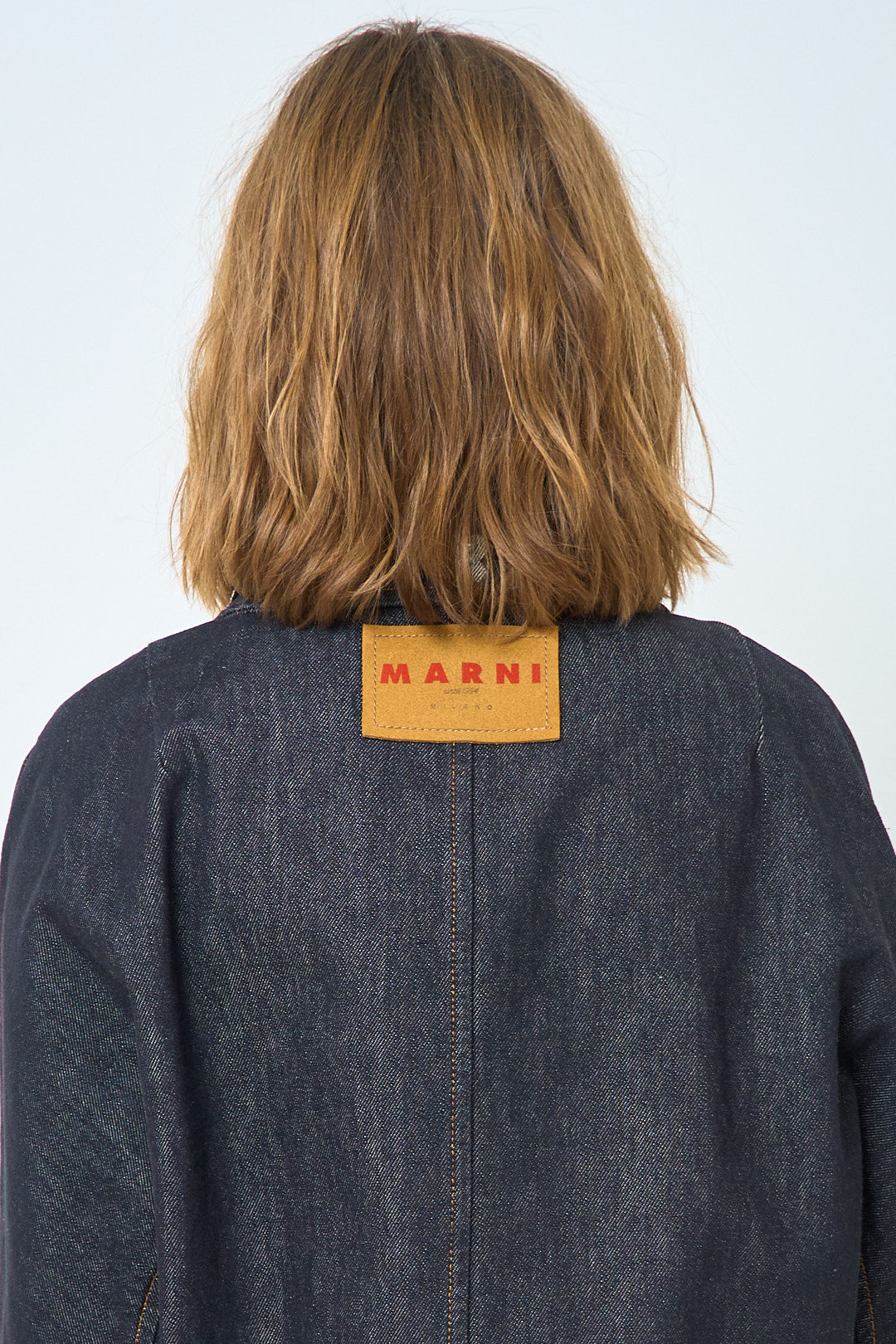 Black Denim Jacket With Daisies from Marni. This jacket is made from a heavy cotton denim. The jacket is designed with a short fit, long sleeves, side pockets, front pockets, and a collar with sewn-on flowers around it. The jacket has a sewn-on Marni logo at the neck, and closes with buttons at the front.