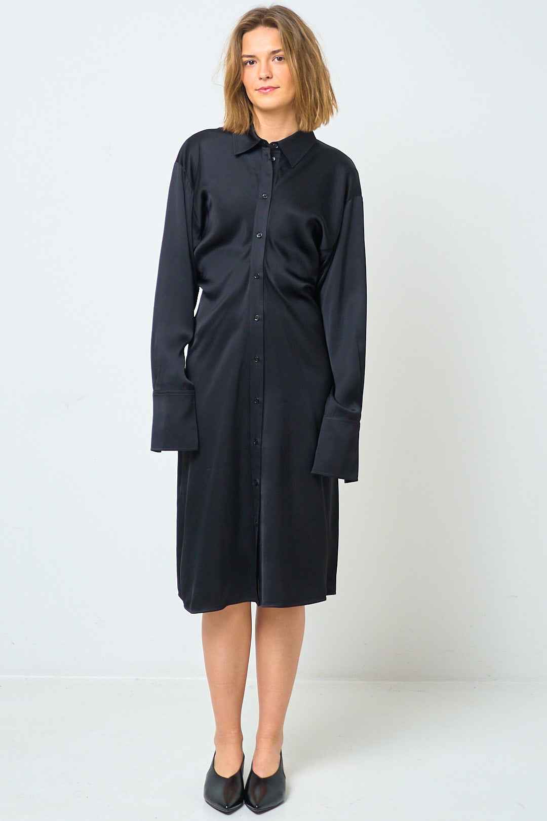 Slouch Shirtdress Black from TOTEME. This dress is made from a shiny viscose. It is designed with details that give a shirt-inspired look. The model has a classic collar, button closure at the front and cuffs with buttons.