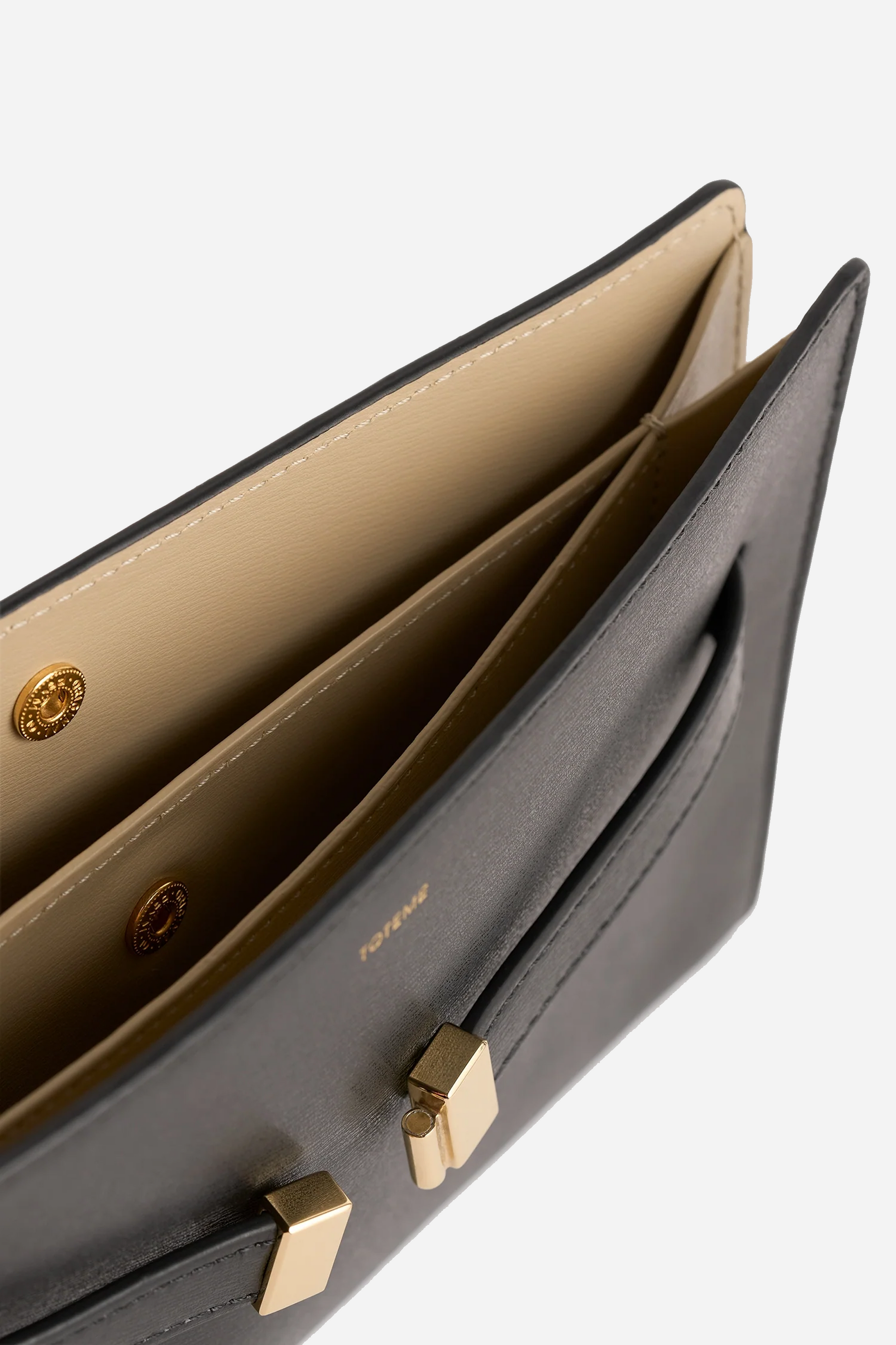 Belted Leather Crossbody Black from TOTEME. This bag is made of leather. The bag is designed with a lock at the front. It contains two larger compartments that close with snap buttons, and an adjustable strap.
