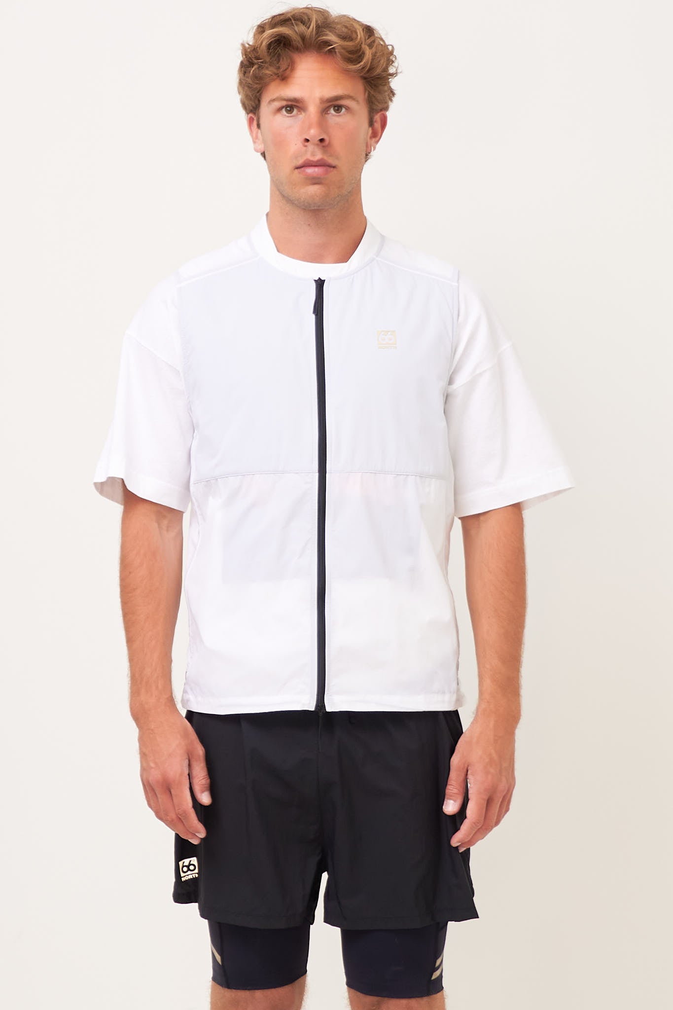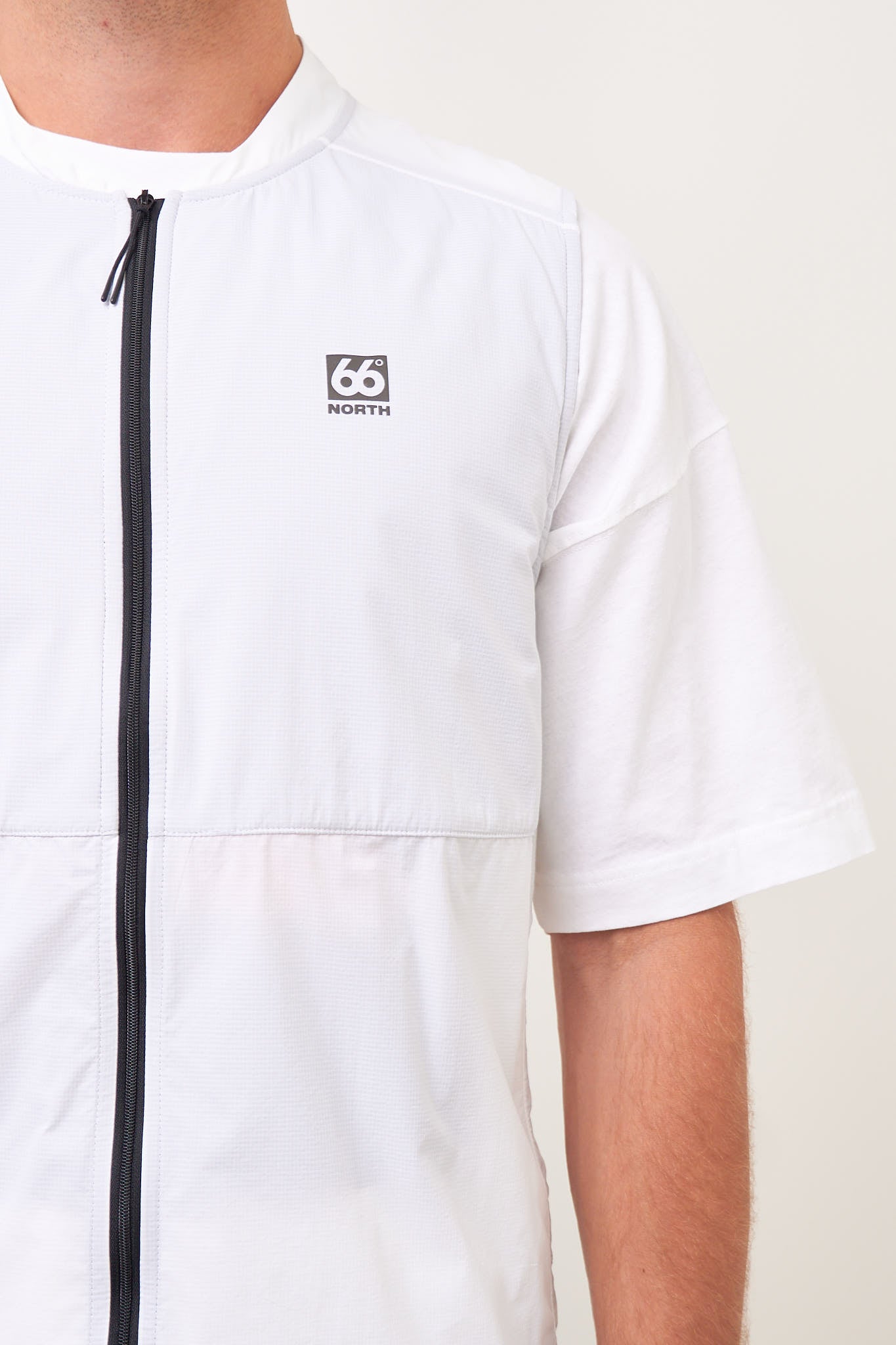 Helgafell Vest White from 66°North. This vest is made from a lightweight polyamide blend. It has a regular fit with a back pocket that closes with a zipper and a 66°North logo on the chest. The vest closes with a zipper.