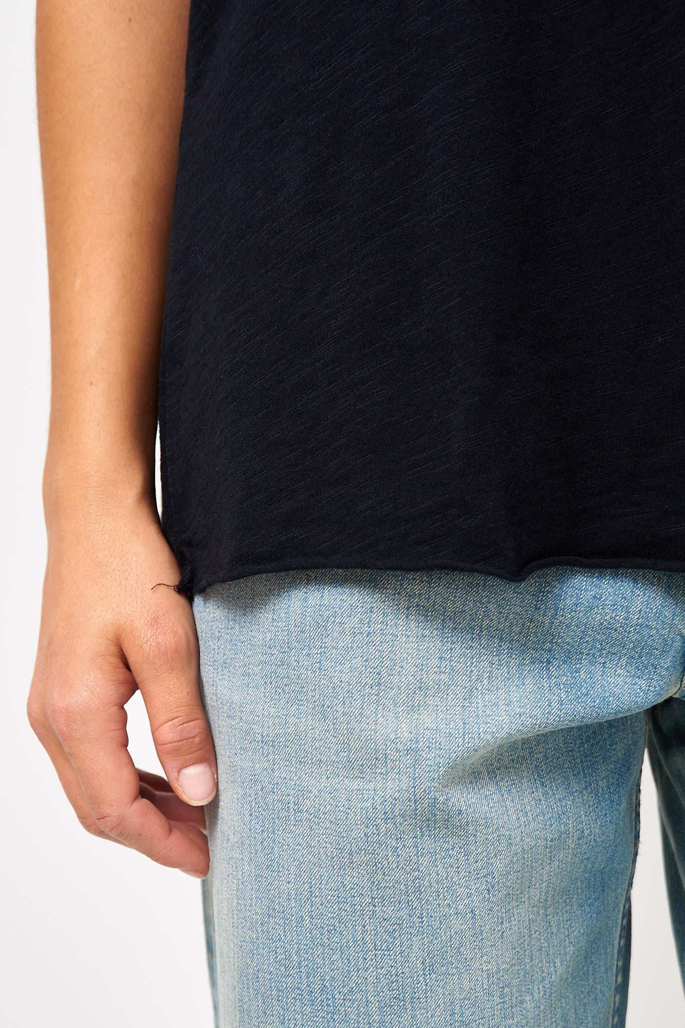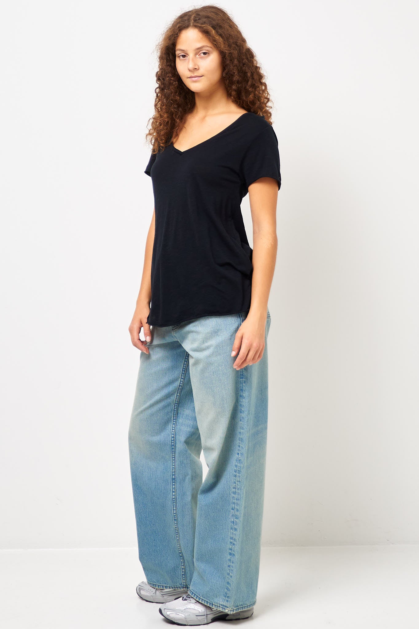 Jacksonville V-neck T-shirt Black from American Vintage. This top is made from a cotton blend. It is designed with a deep V-neck, short sleeves and has a regular fit.