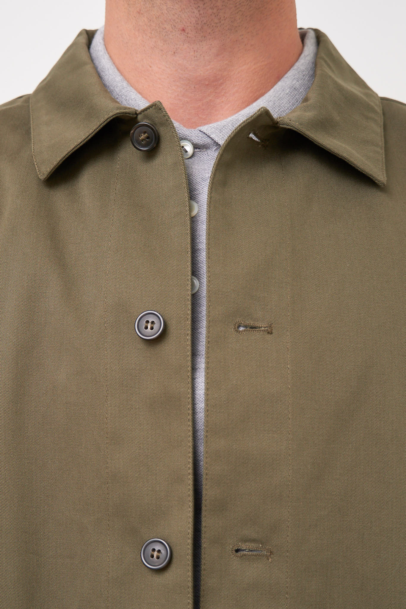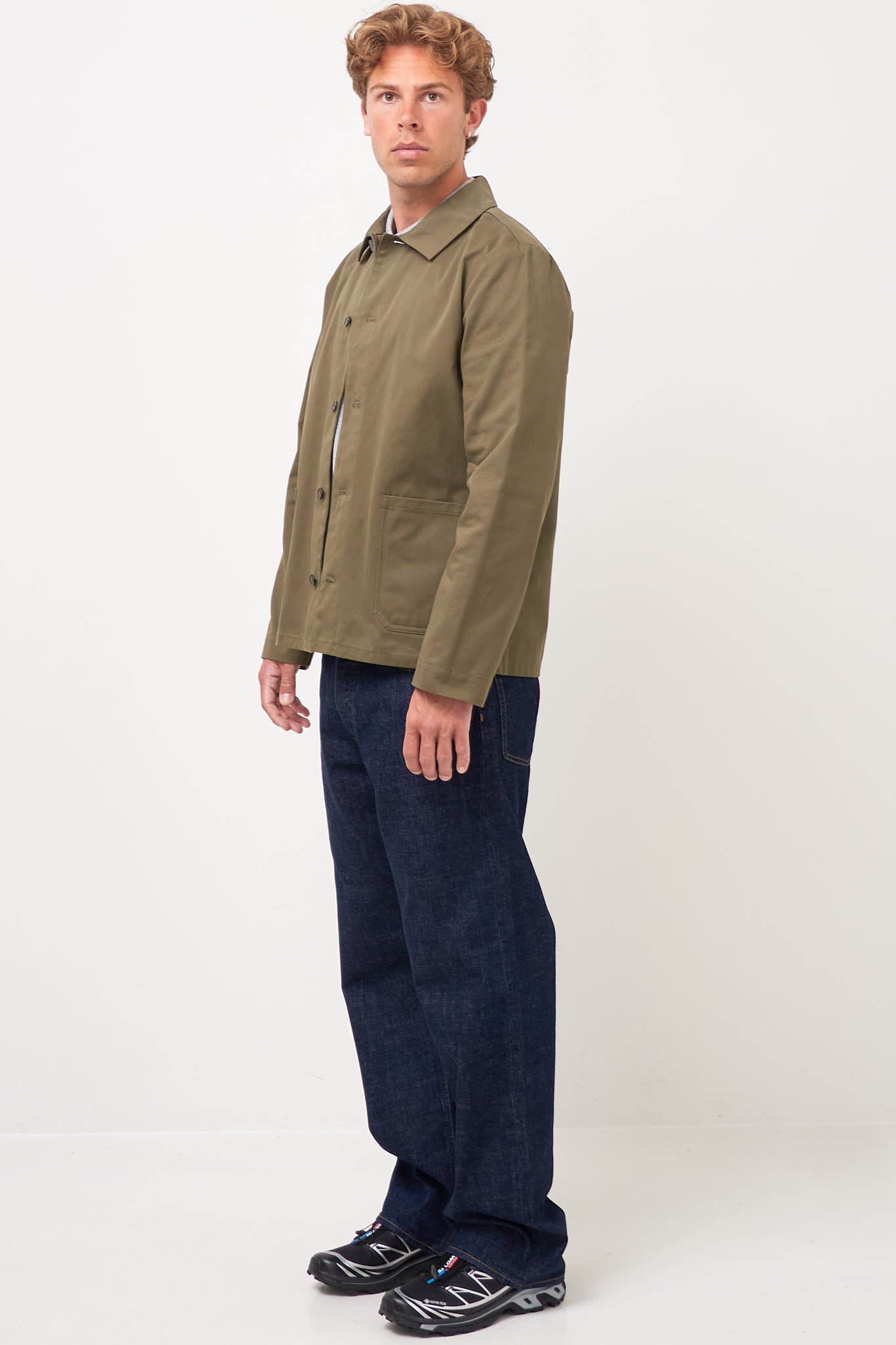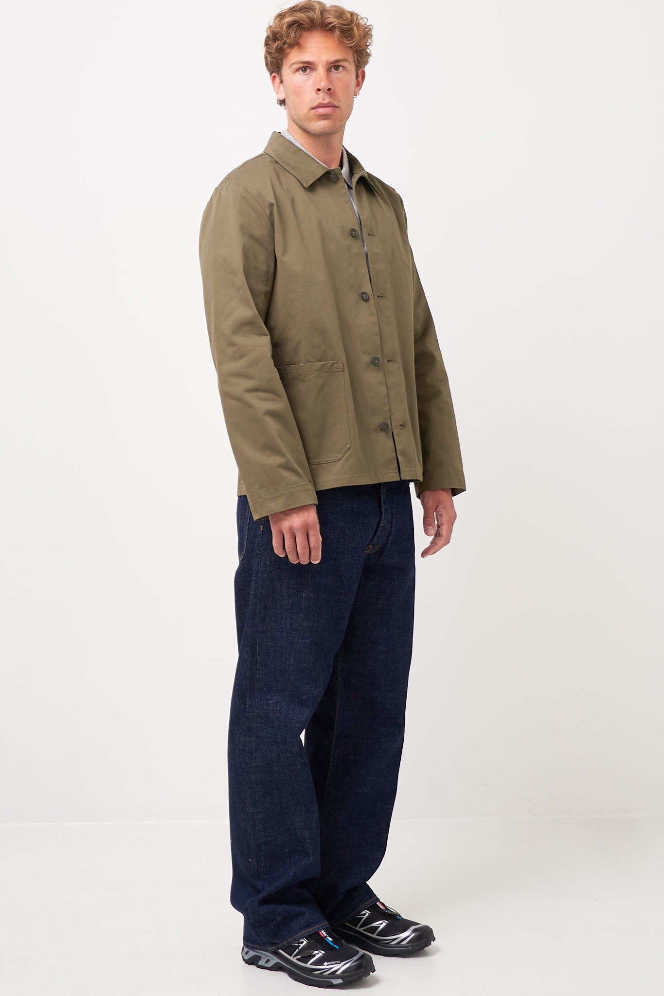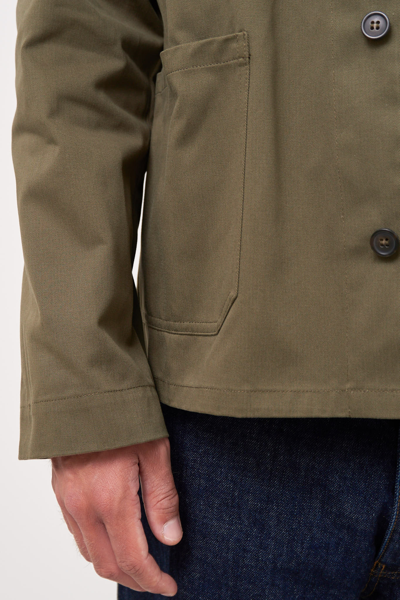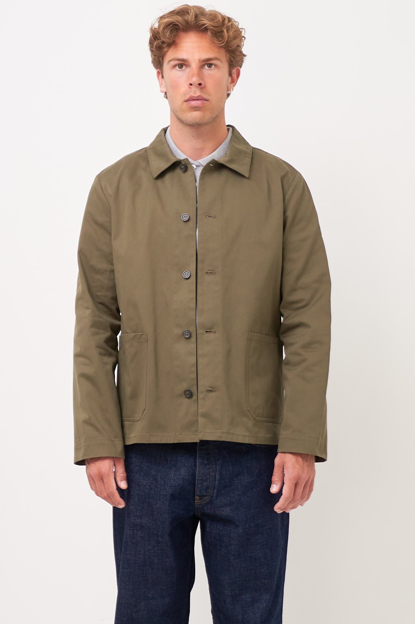 Kerlouan Brodée Jacket Kaki Militaire from APC This jacket is made of heavy cotton. It is designed in a regular fit, with long sleeves and a collar. The jacket has two front pockets, and an embroidered APC logo on the bottom of the left pocket. It closes with buttons at the front.
