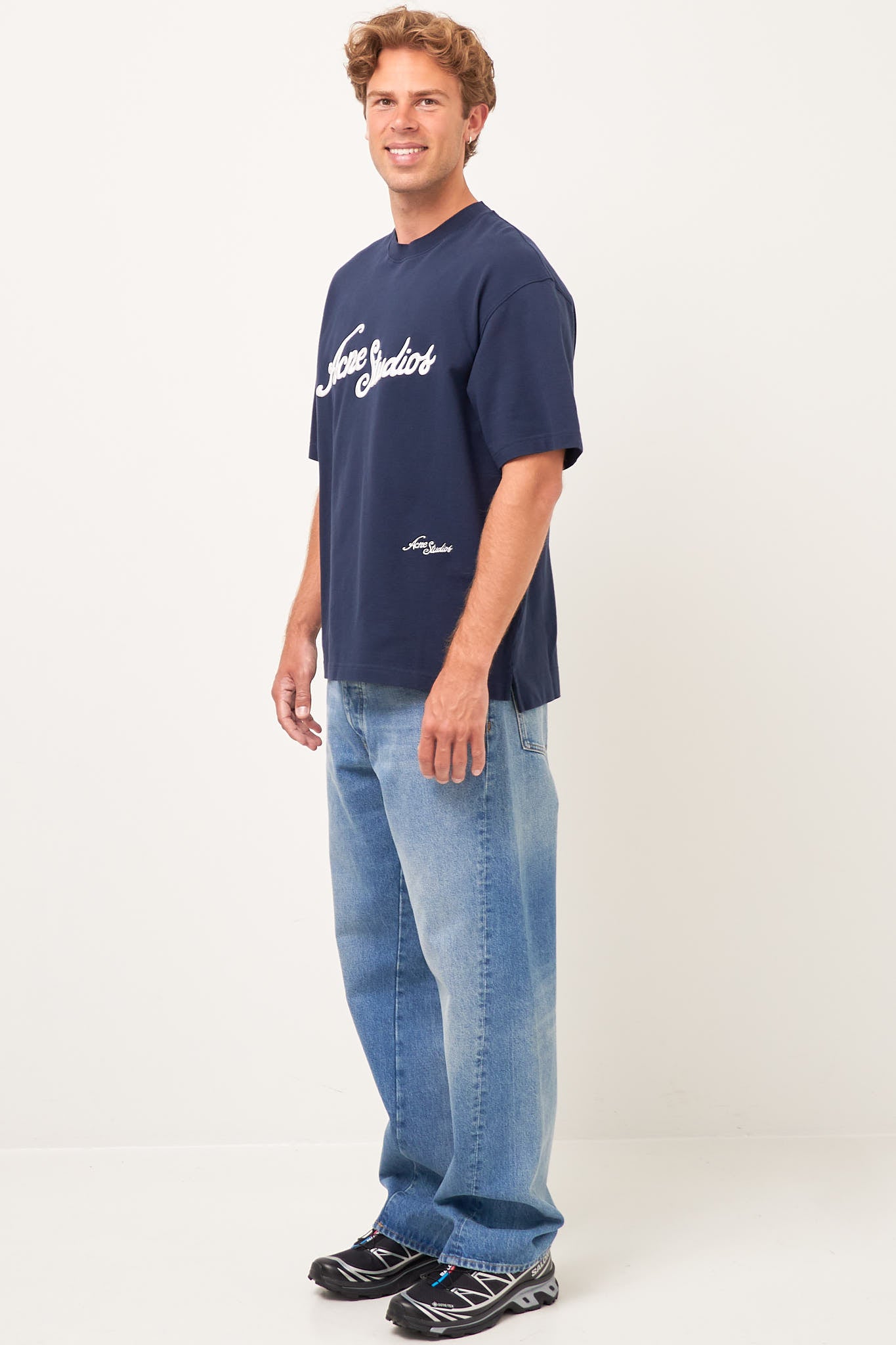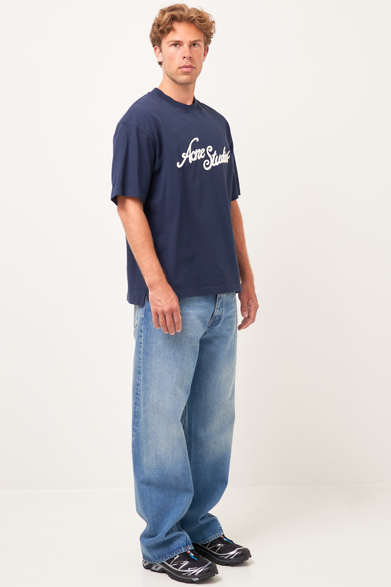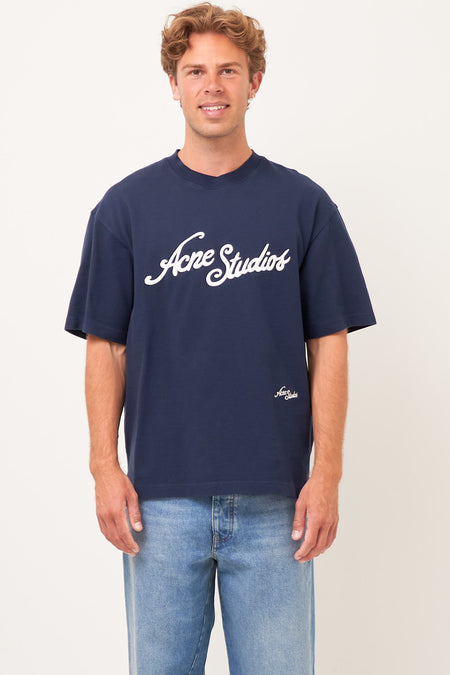 Logo T-Shirt Deep Blue from Acne Studios. This t-shirt is made from a textured cotton. It has a relaxed fit with a round neckline and short sleeves. The t-shirt has a larger Acne Studios logo on the chest and a smaller logo at the bottom.