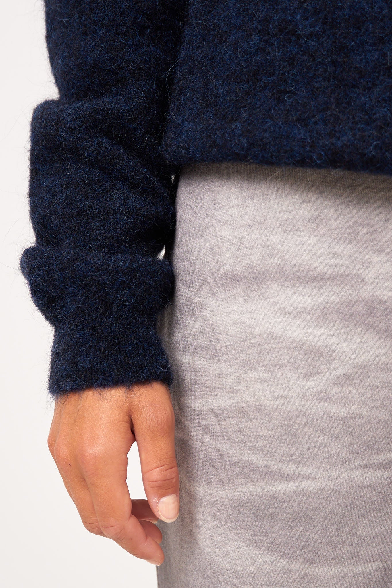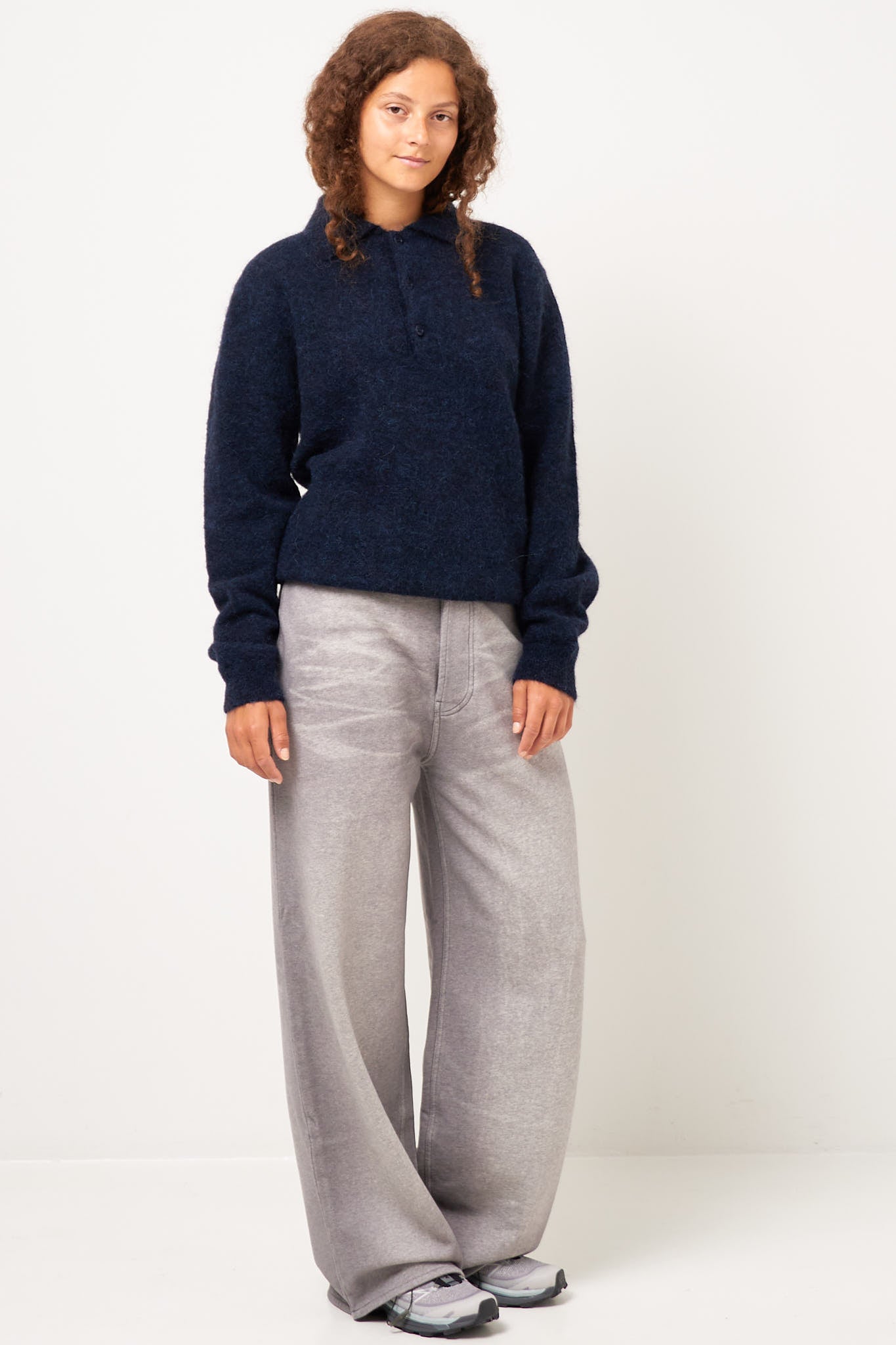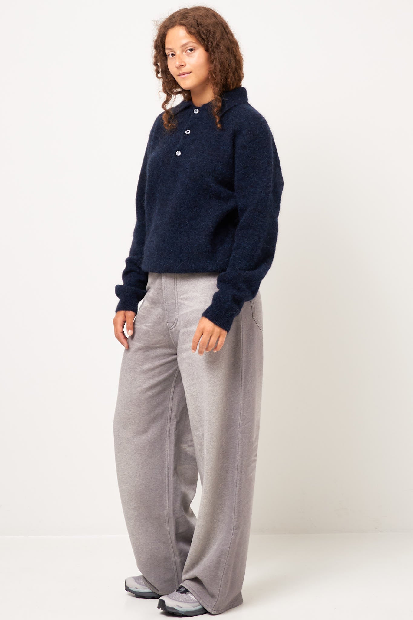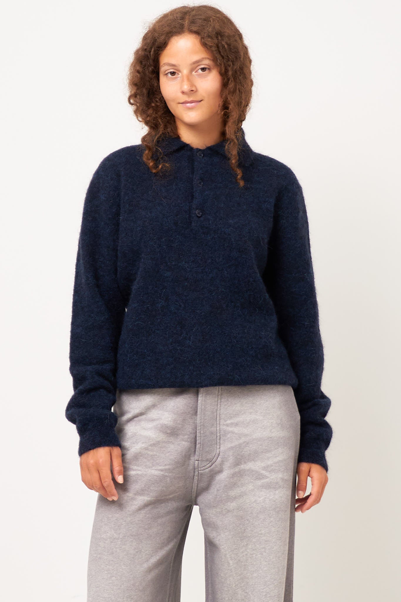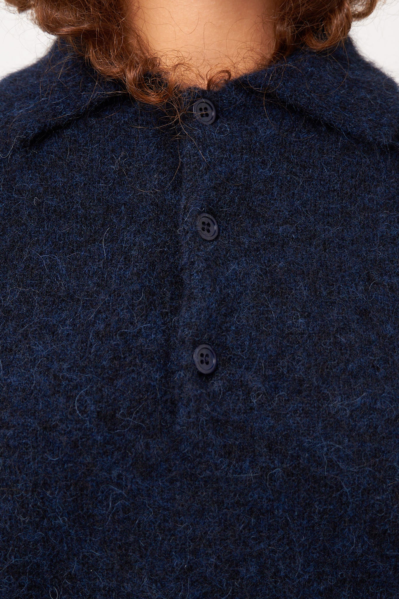 Mohair Polo Navy from Sunflower. This knit is made from a mohair and alpaca blend. It has a regular fit with a collar and buttons at the neck.