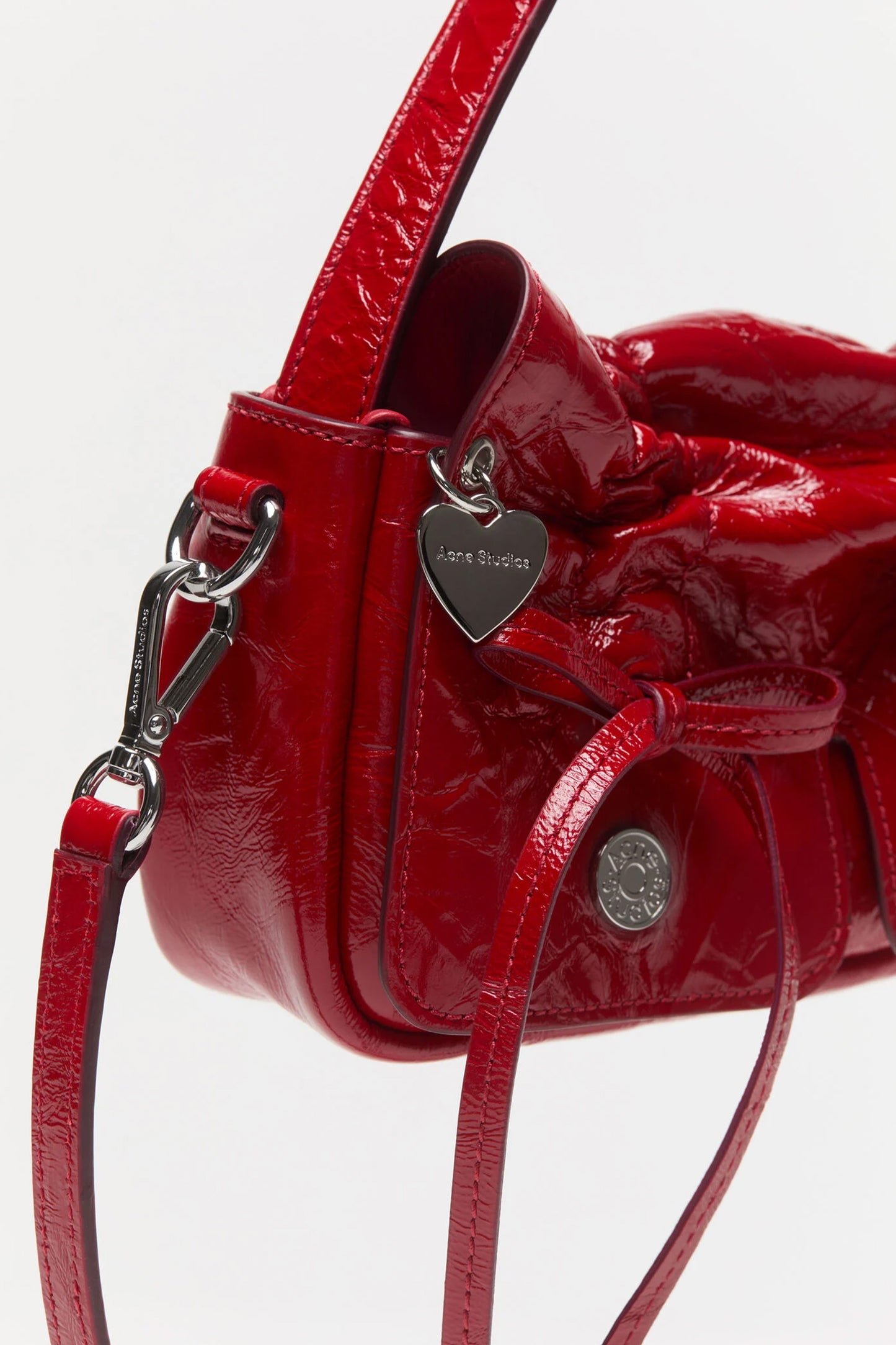 Multipocket Micro Bag Red from Acne Studios. This bag is made of calf leather. It is designed with two bows on the front, a heart-shaped metal pendant on the right side and an Acne Studios logo on the top of the handle. The bag has a removable strap and closes with two magnets on the front.