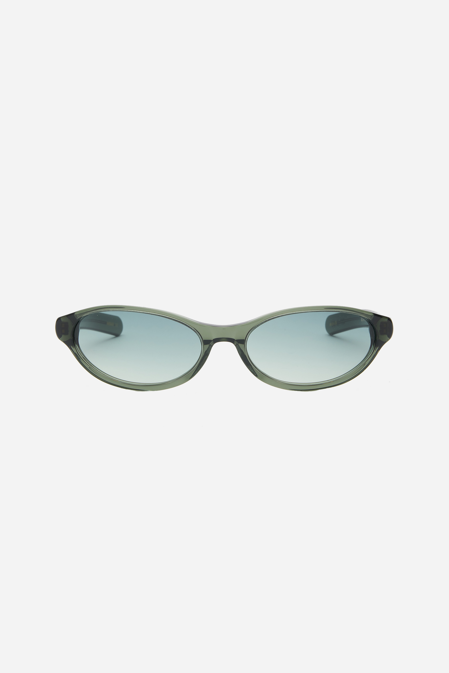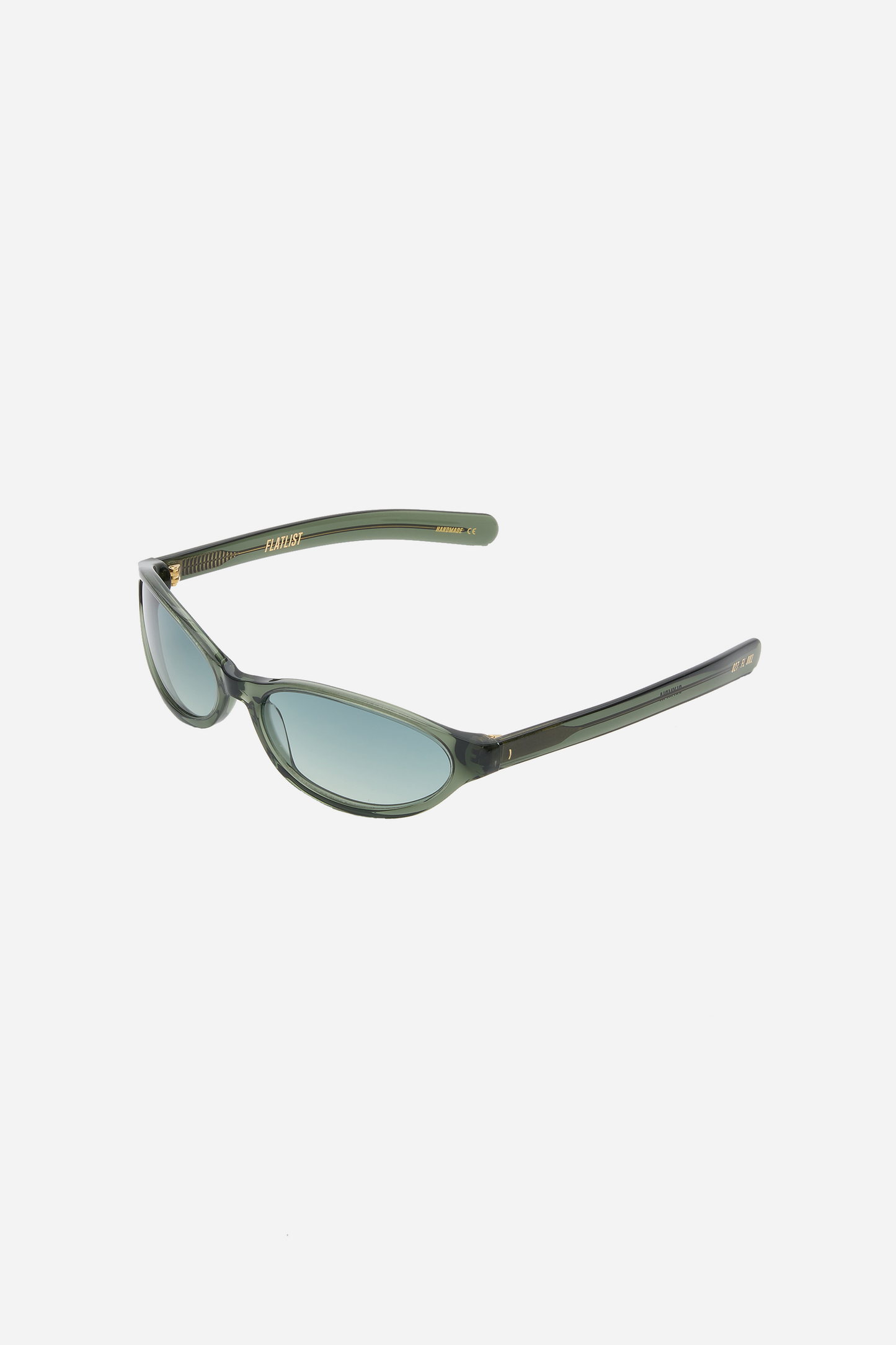 Olympia Crystal Duck Green/Green Gradient Lens from Flatlist Eyewear. The sunglasses are made of handmade acetate. They have scratch-free lenses with 100% UVA/UVB protection and come in a box with case and microfiber cloth.