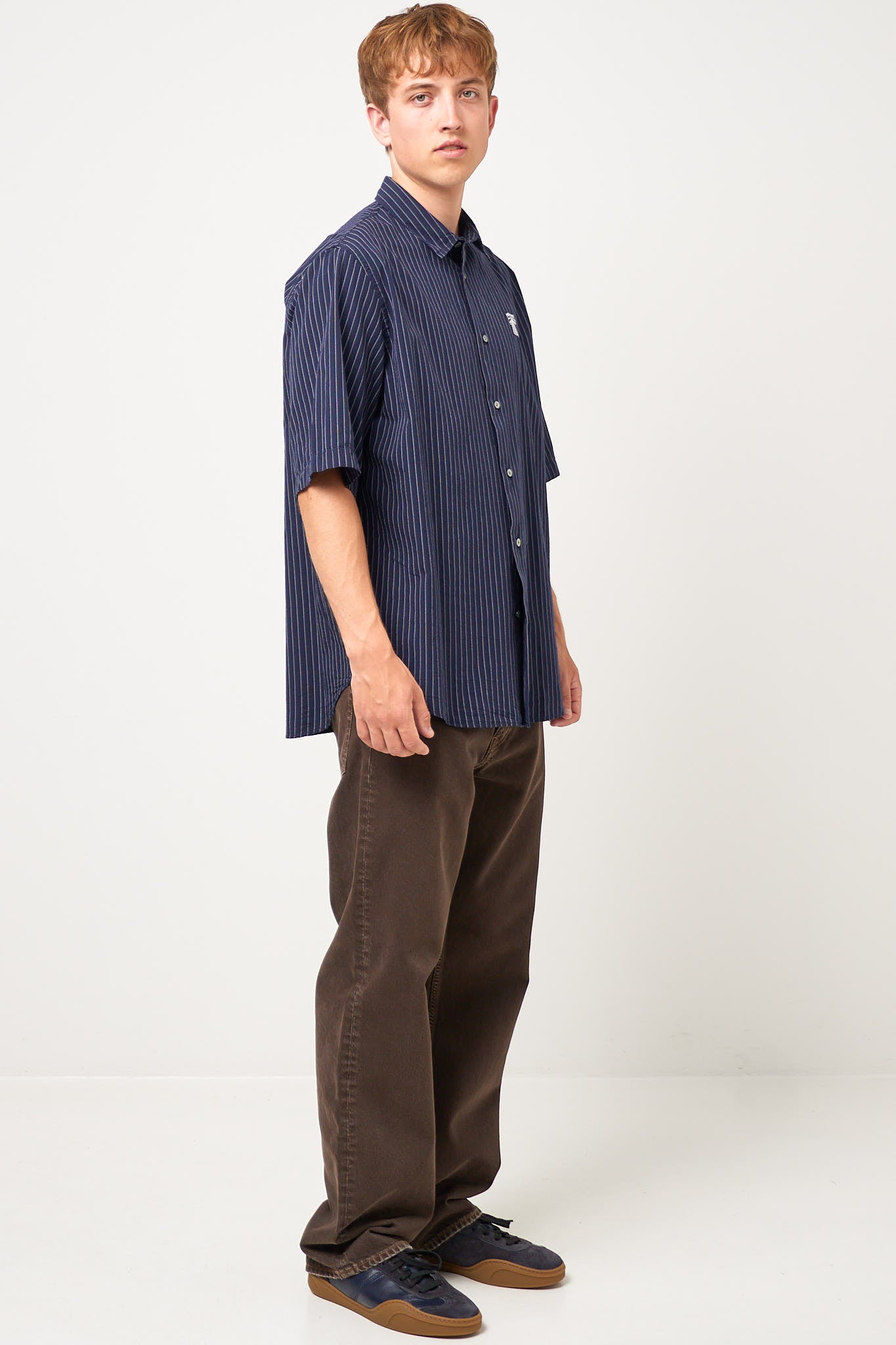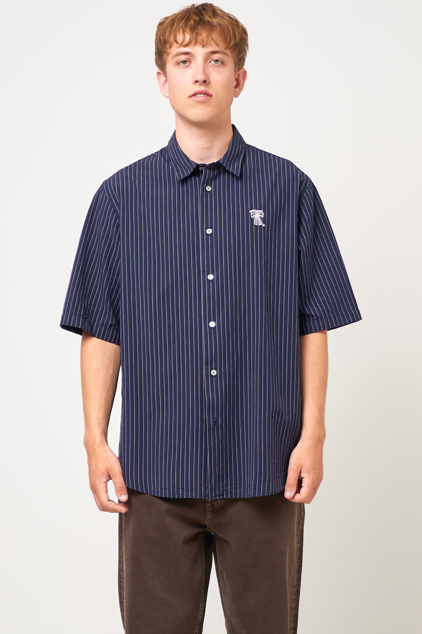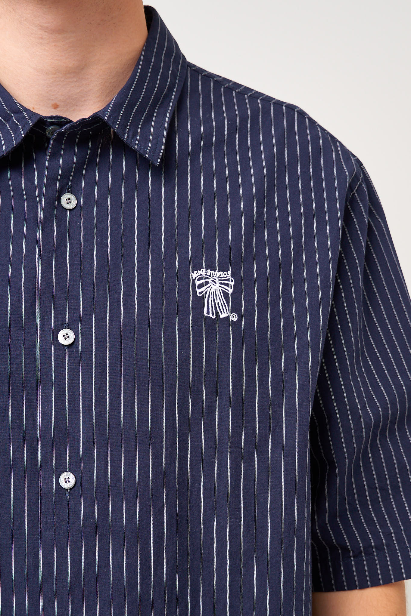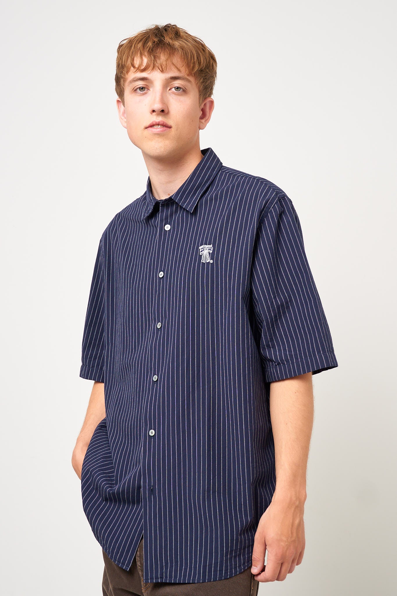 Short Sleeve Shirt Navy/White from Acne Studios. This shirt is made from a soft cotton. It has a regular fit with short sleeves and an Acne Studios logo on the chest.