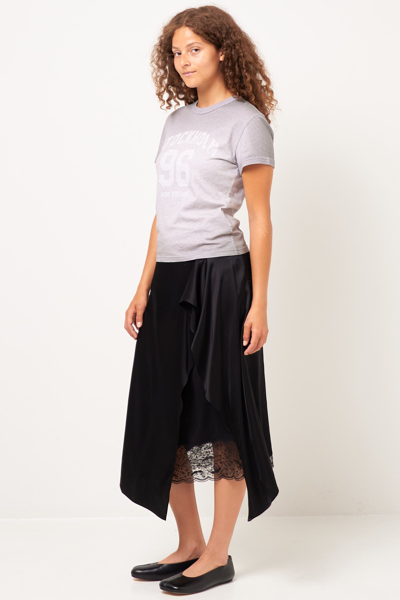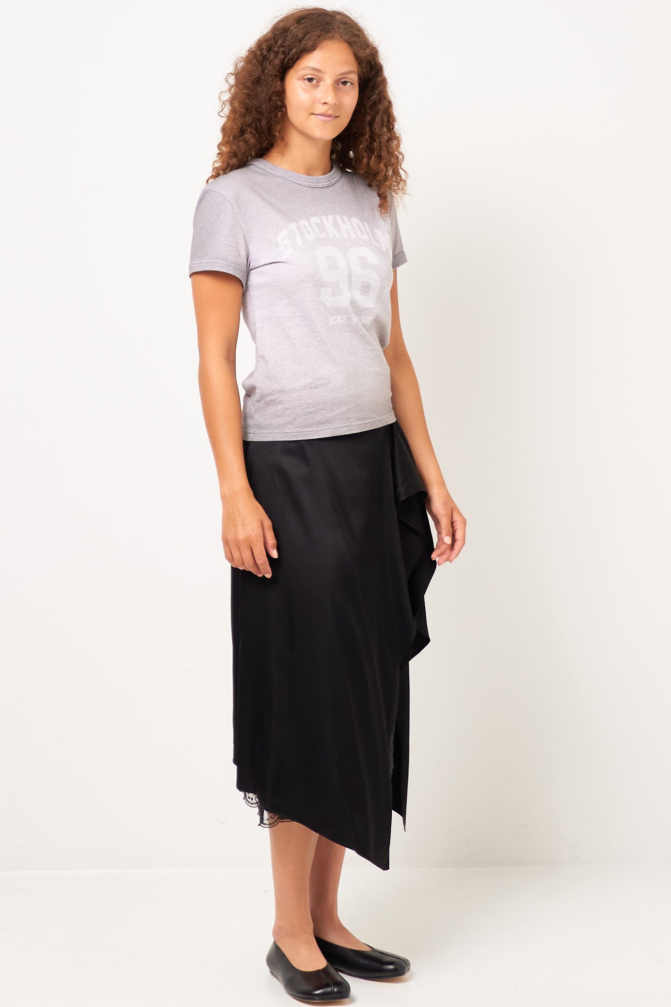 Sprayed Vintage Logo T-Shirt Grey Melange from Acne Studios. This t-shirt is made from soft cotton. It has a short and tight fit with short sleeves and a round neckline. The t-shirt has an Acne Studios logo on the front.