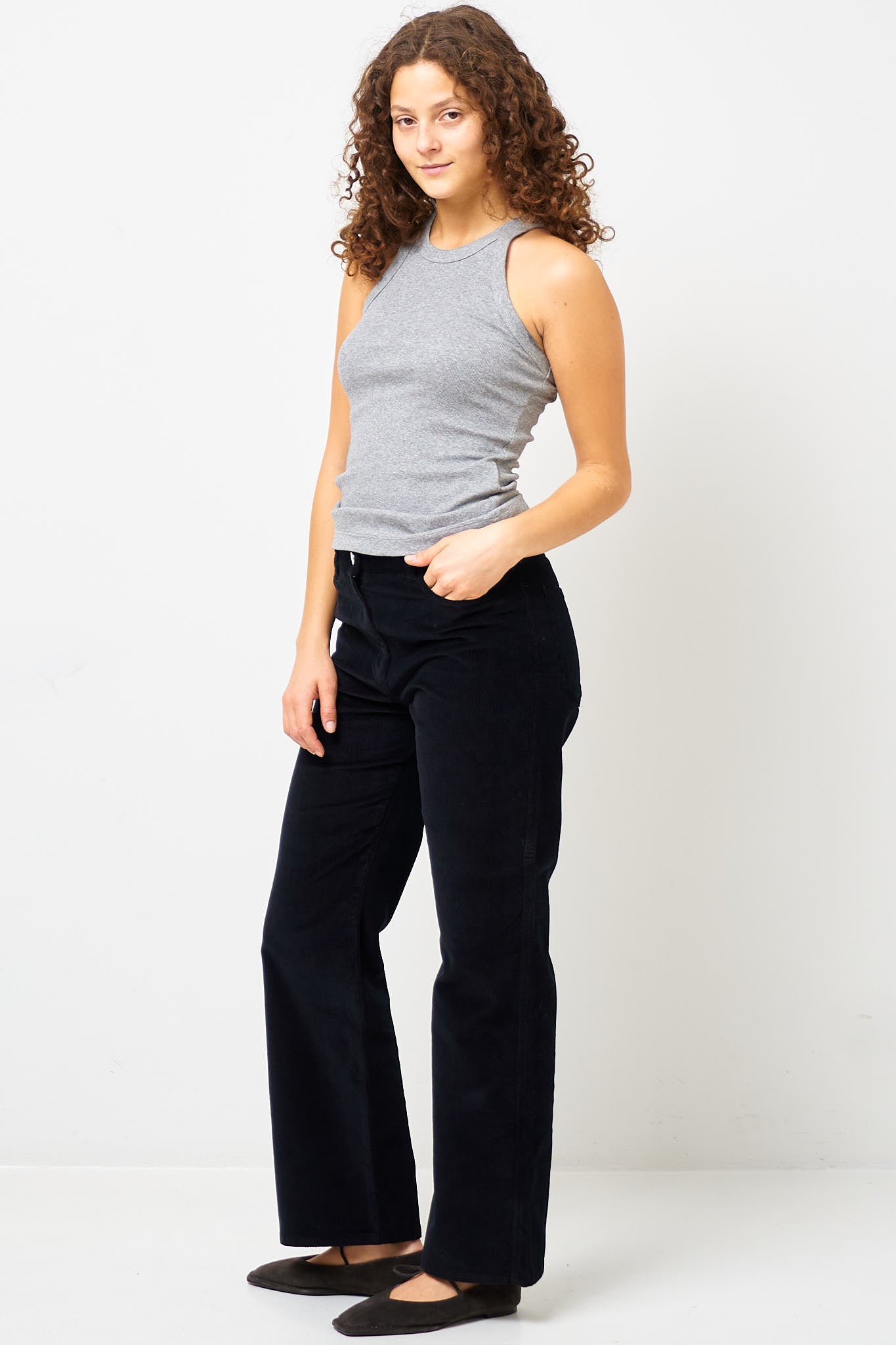 Straight Cord Trousers Black from TOTEME. These trousers are made from a soft velvet cotton. They have a short length with straight legs and a mid-rise waist. The trousers have 5 pockets and close with a zipper and button.