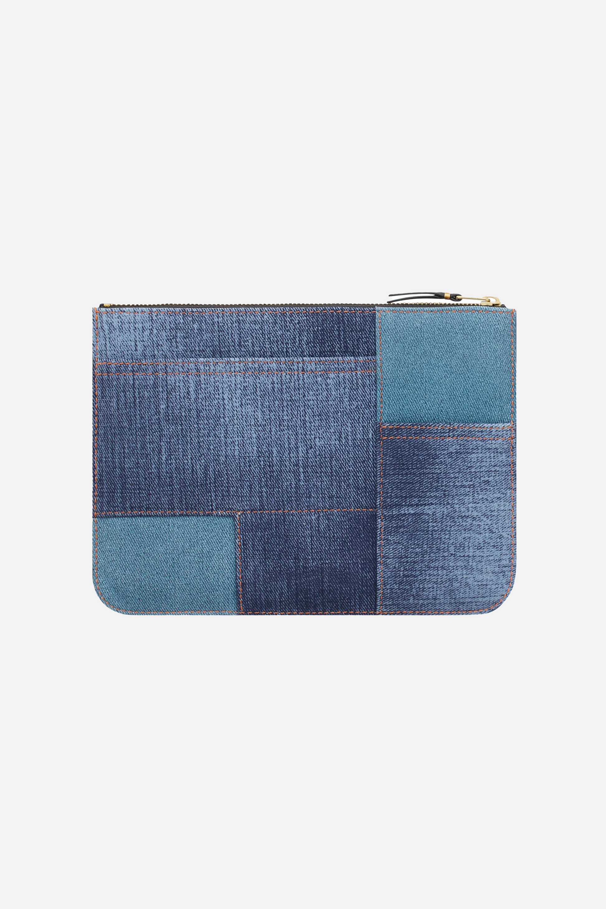Wallet Denim Pocket Large from Comme des Garçons Wallet. This wallet is made of leather and denim. It is designed with denim patchwork. The wallet closes with a zipper at the top and features a Comme des Garçons Wallet logo on the front.