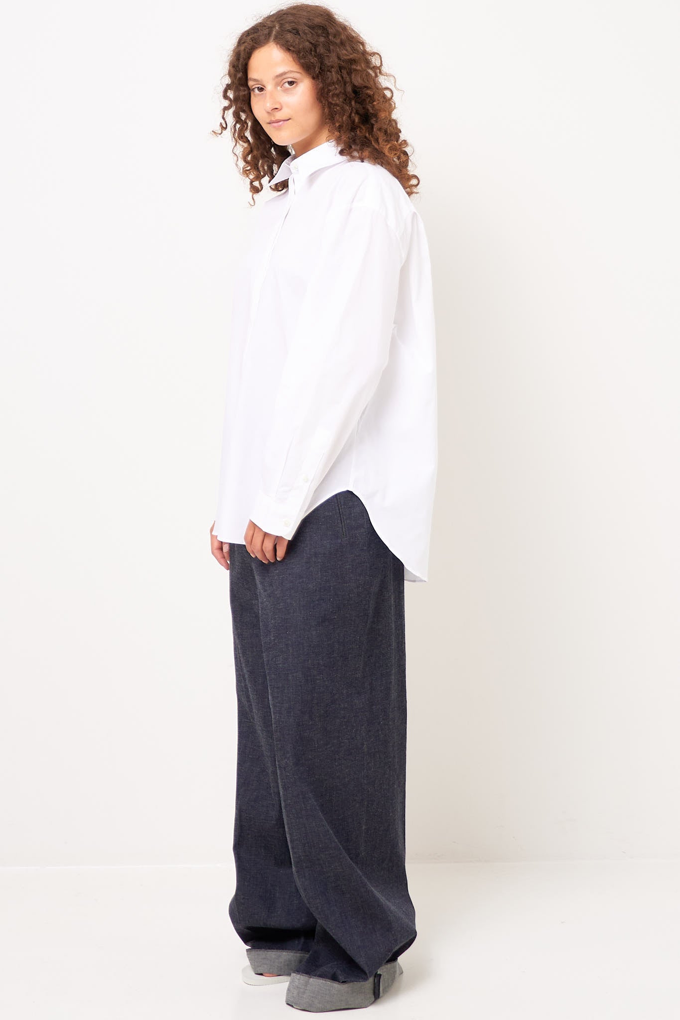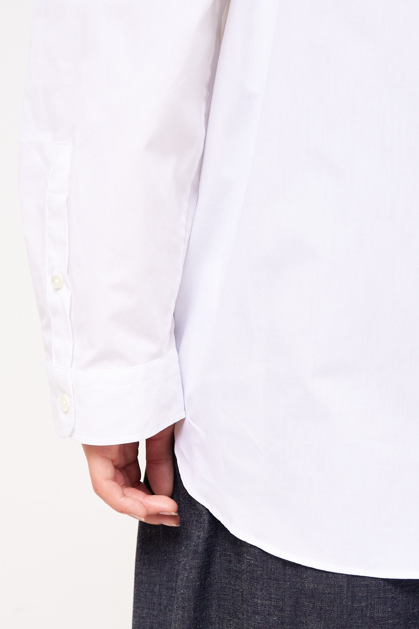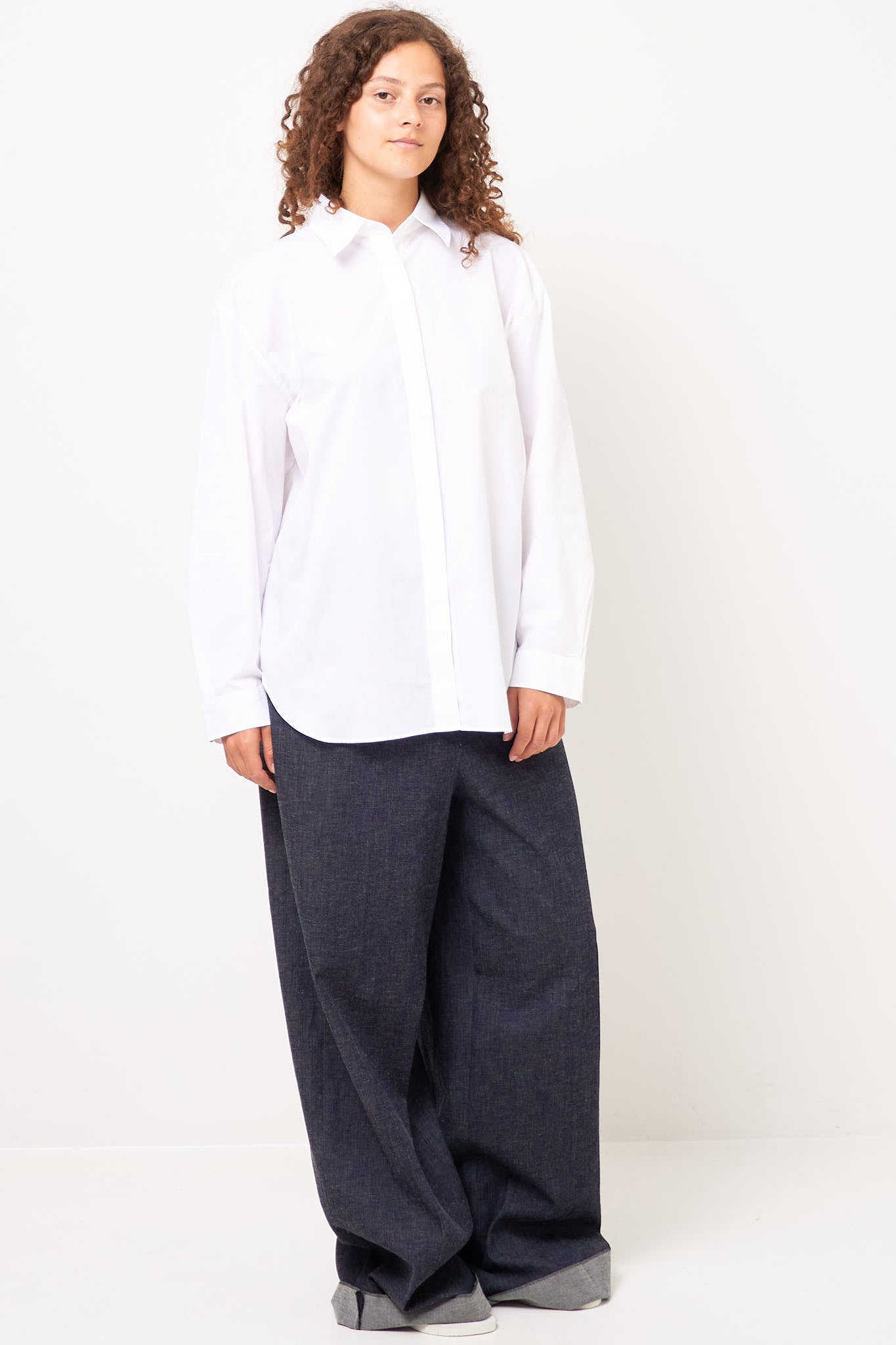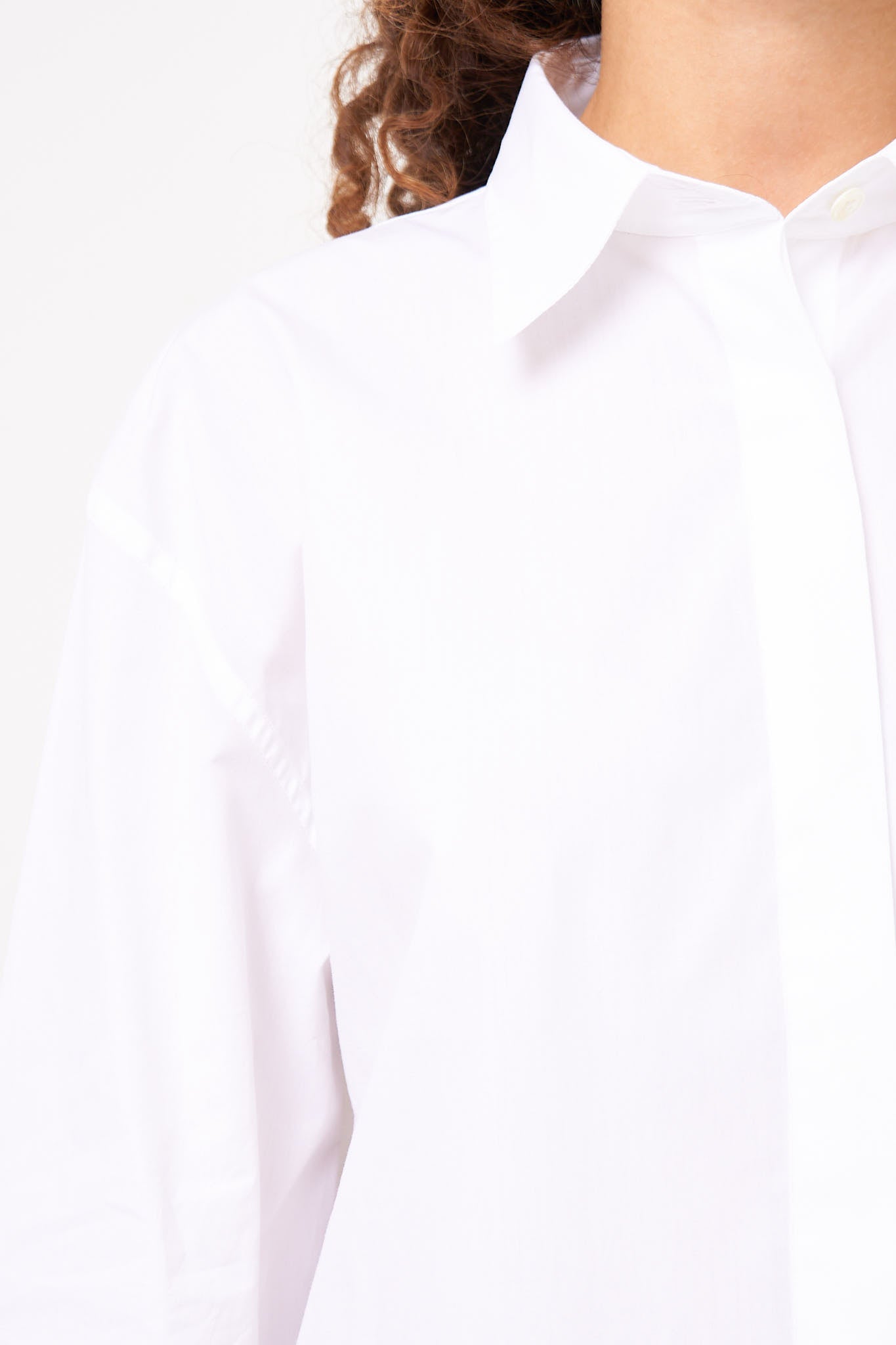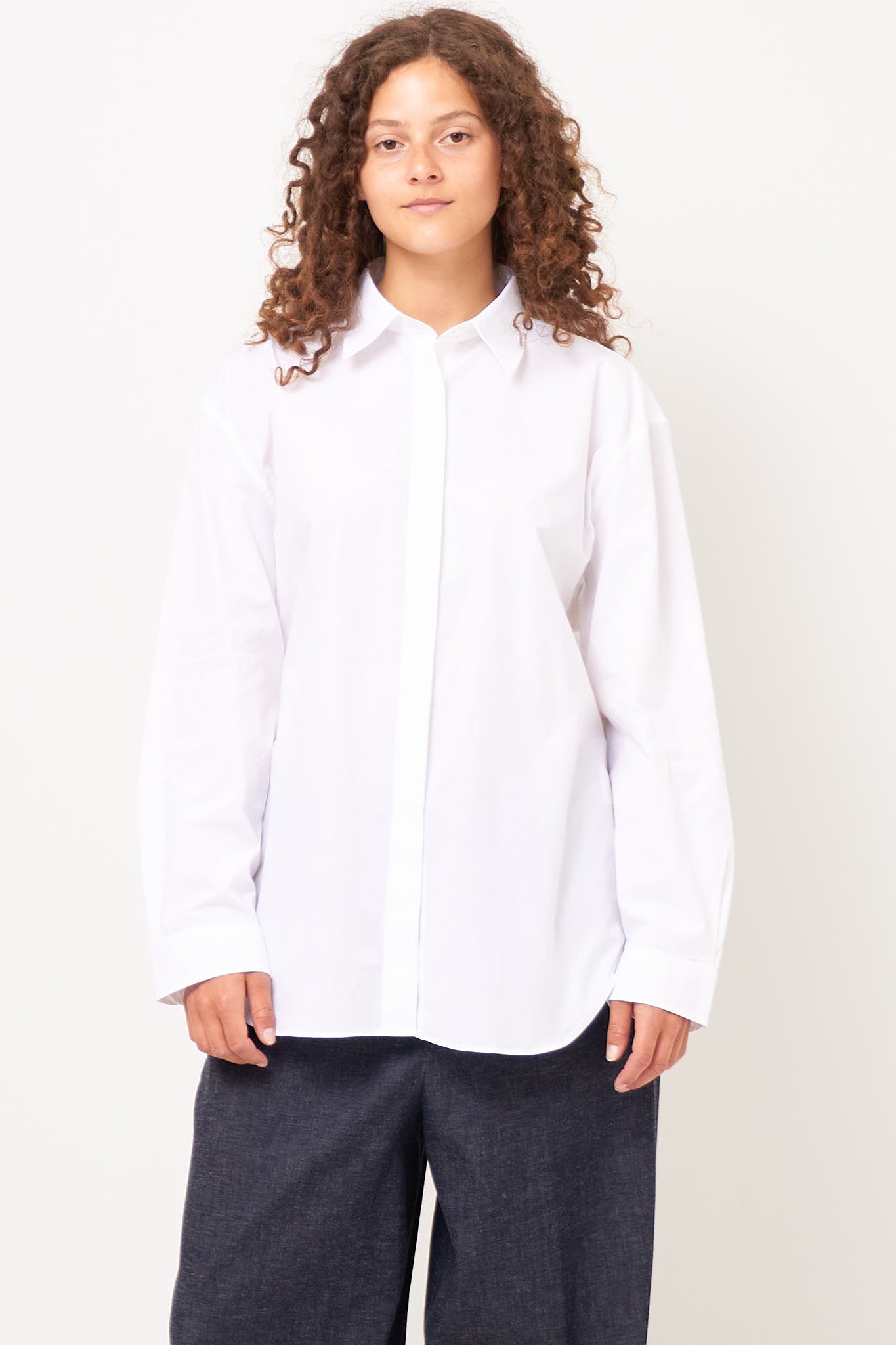 Wanda Shirt White from STRØM. This shirt is made from cotton poplin. It is designed in a boxy fit with dropped shoulders and is longer in the back than in the front. The shirt has a classic shirt collar, wide sleeves and rounded side slits. It has a concealed button closure and mother-of-pearl buttons.