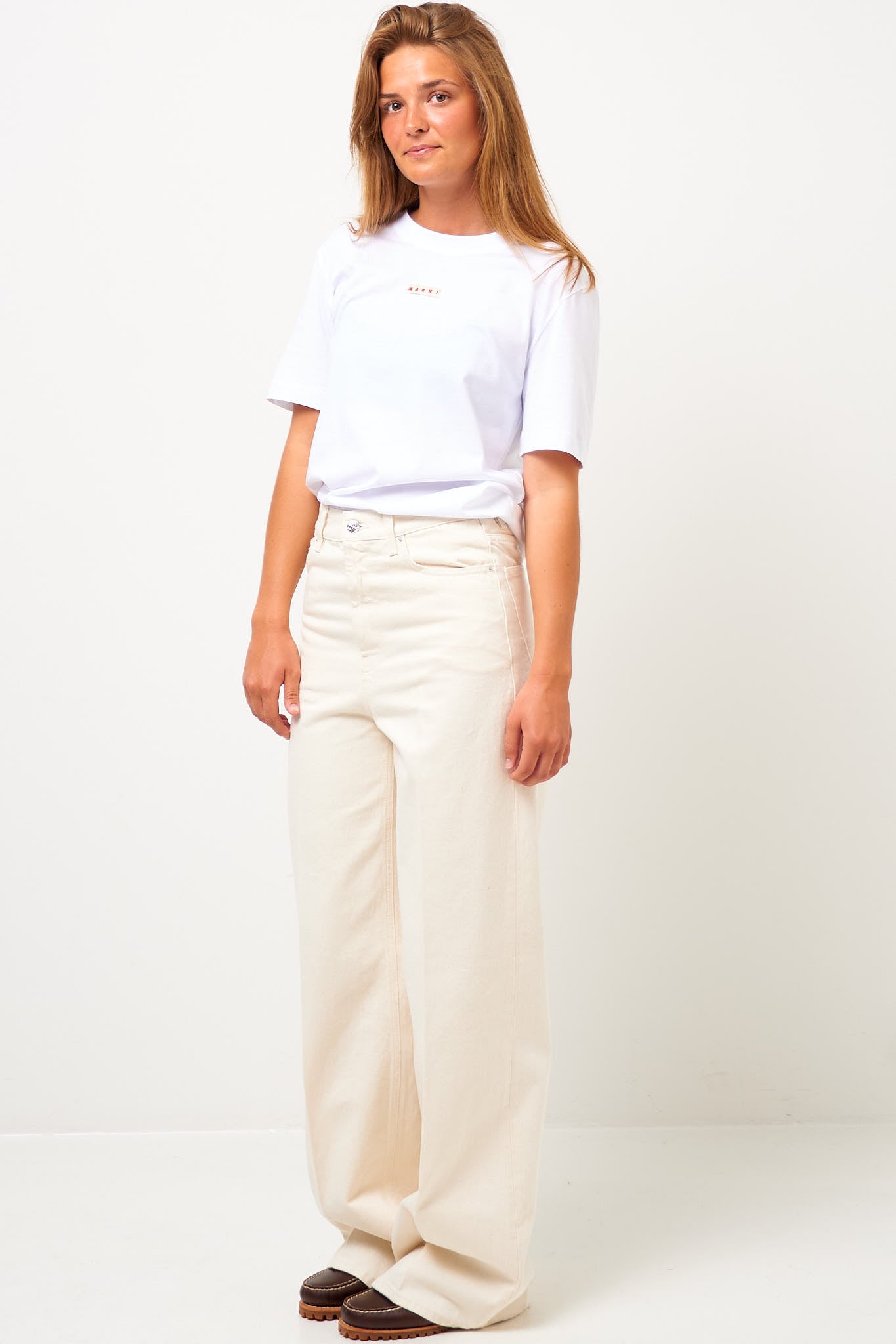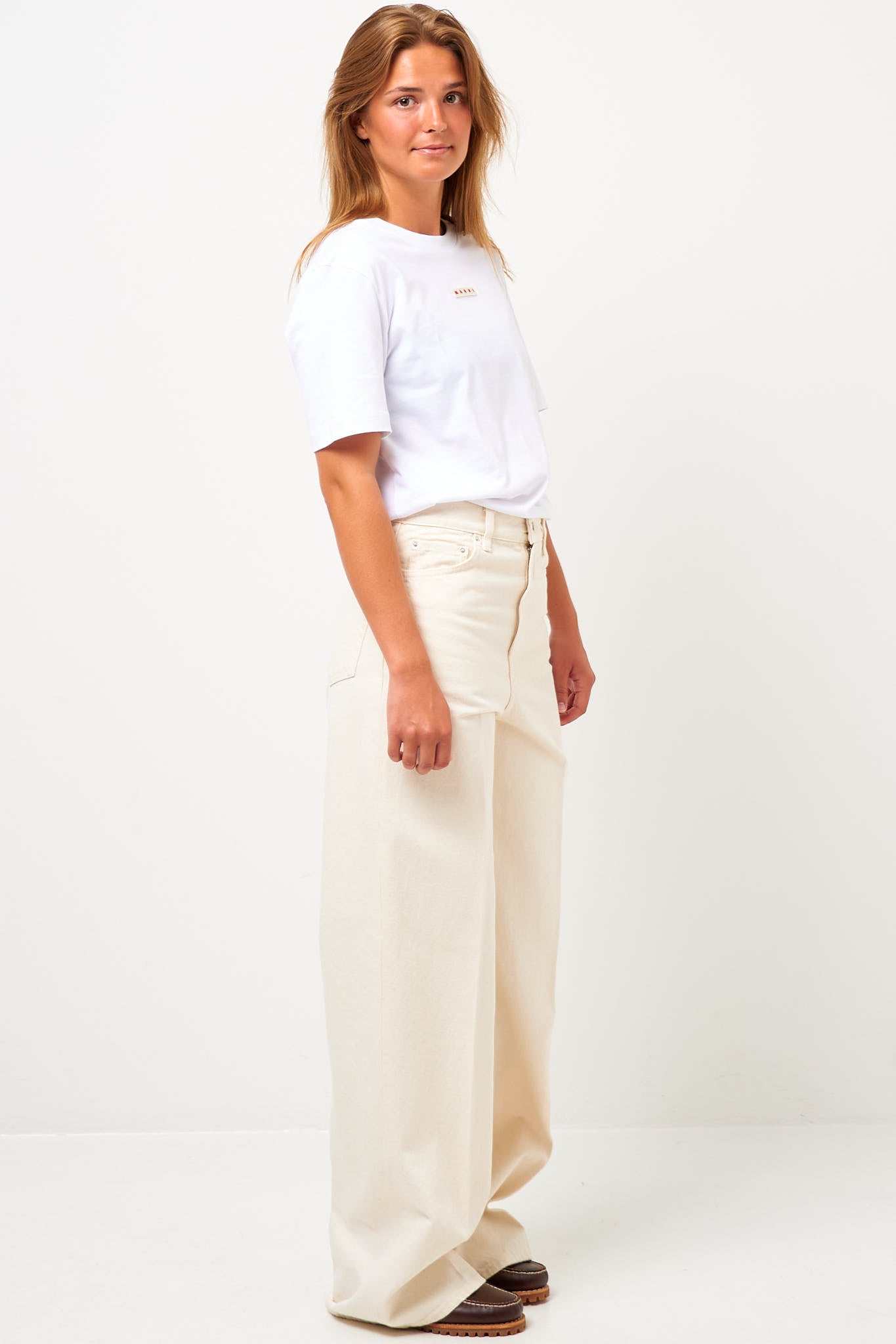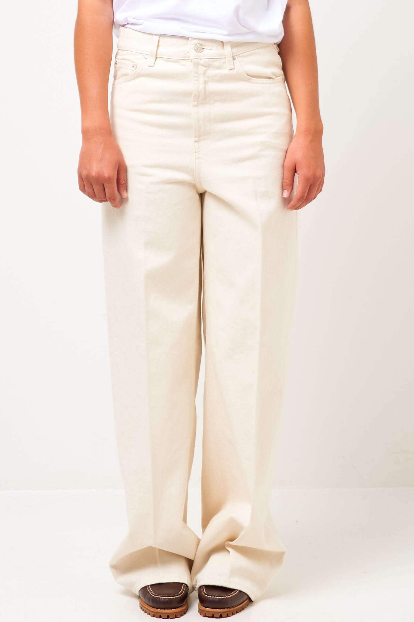 Wide Leg Denim Ecru from TOTEME. These trousers are made from organic cotton. They are designed with a high waist and full-length wide legs. The trousers have press pleats at the front, belt loops and a zip and button closure.