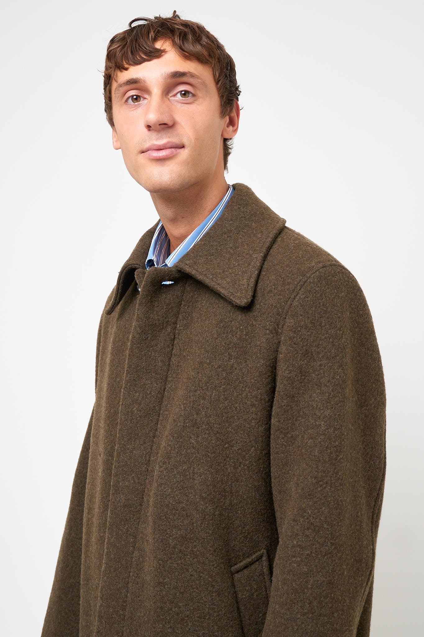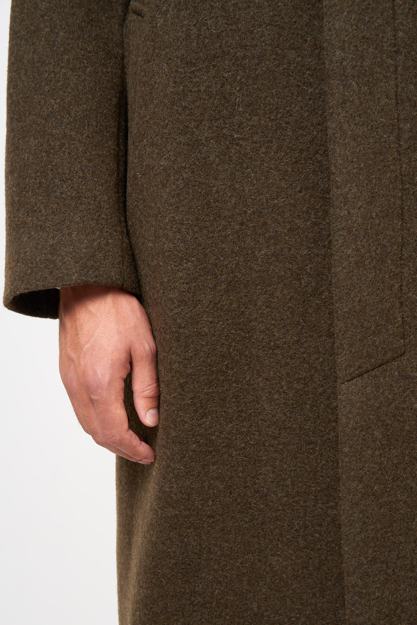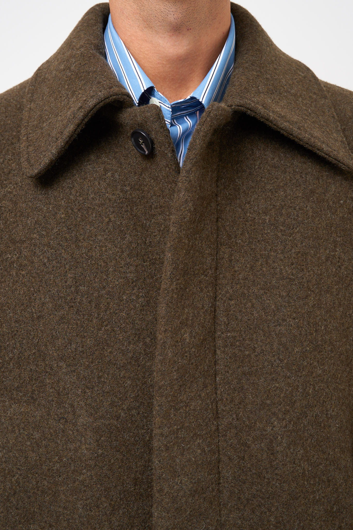 Winter Coat Green Moss from Sunflower. This coat is made from a heavy wool blend. It has a relaxed fit with side pockets and a collar. The coat closes with buttons.