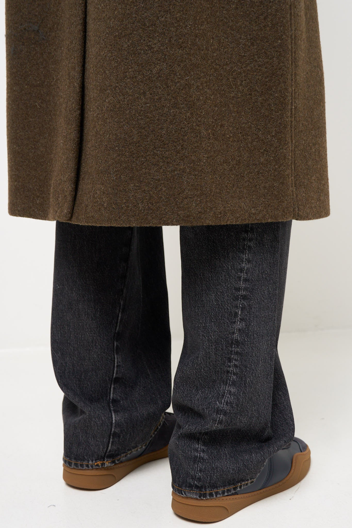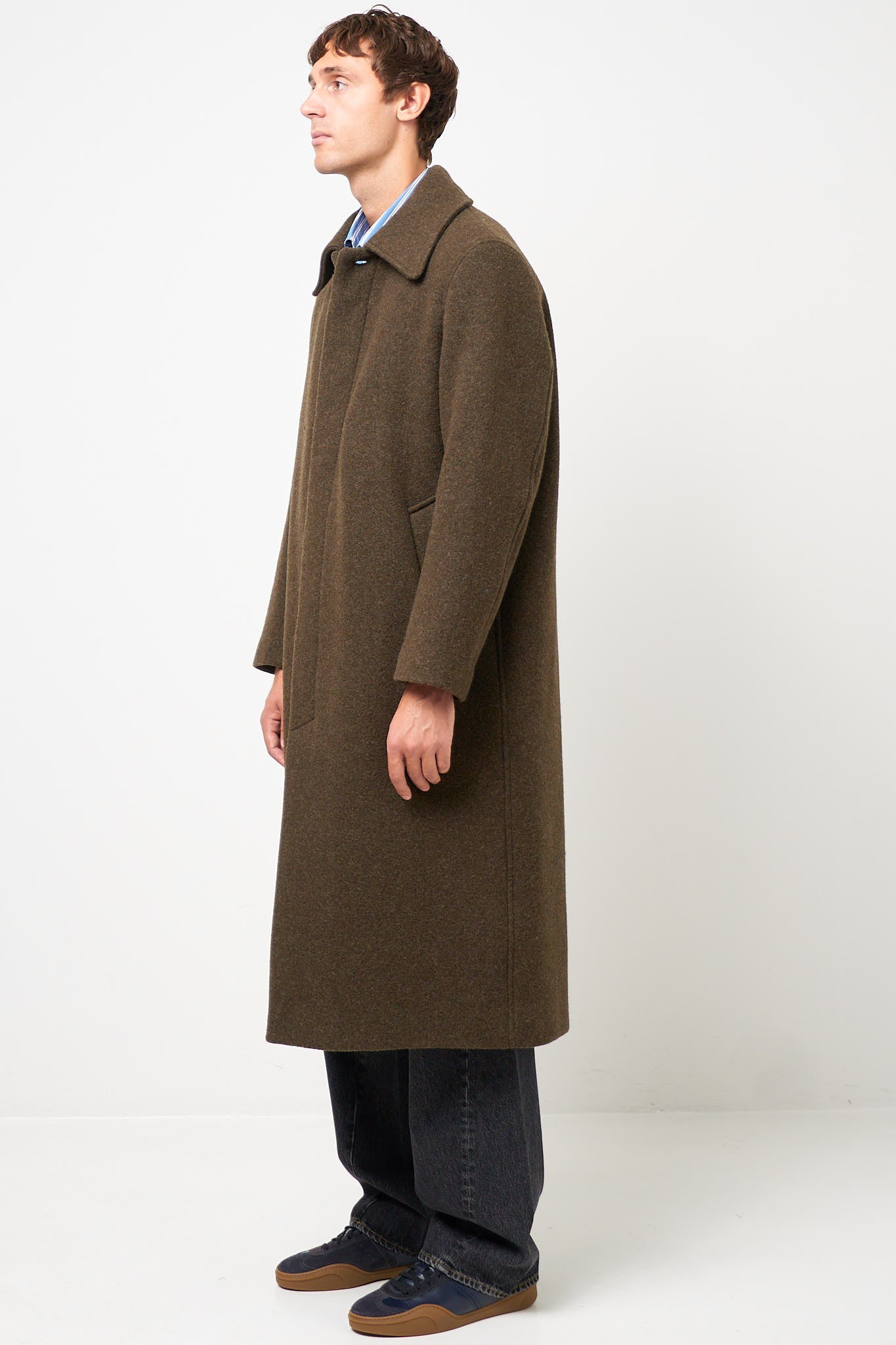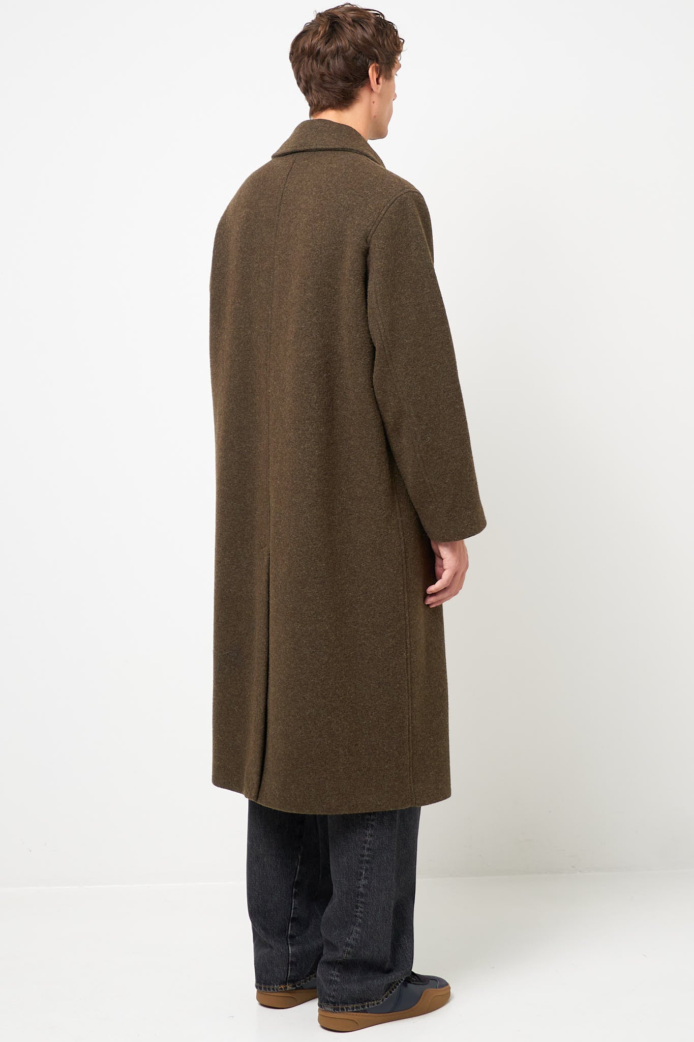 Winter Coat Green Moss from Sunflower. This coat is made from a heavy wool blend. It has a relaxed fit with side pockets and a collar. The coat closes with buttons.